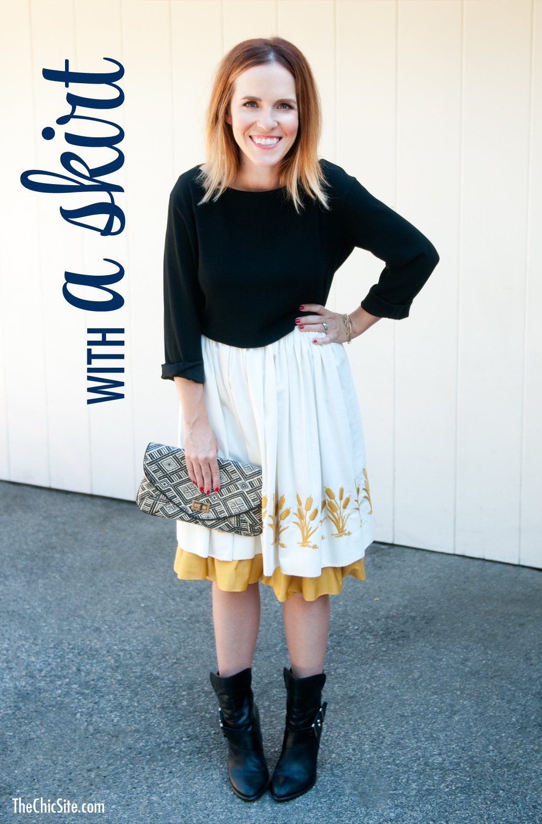 First up, style booties with a skirt! I wear these booties with skirts and dresses all the time because it gives me a heel without killing my feet. If I’m going out and plan to be on my feet all night there’s a 99.9% chance you’ll find these booties at the end of my stems. In this pic I style a full vintage skirt (similar styles are all over right now) with a black crop top and my favorite textured clutch.