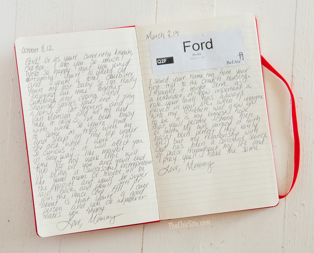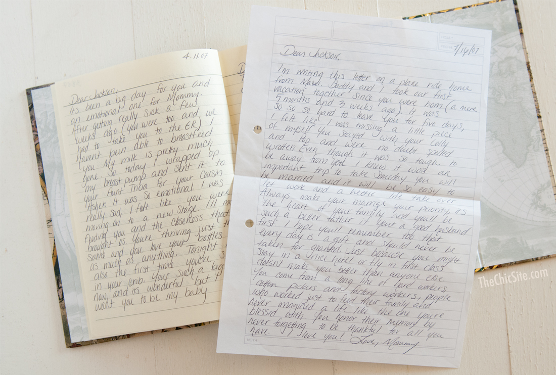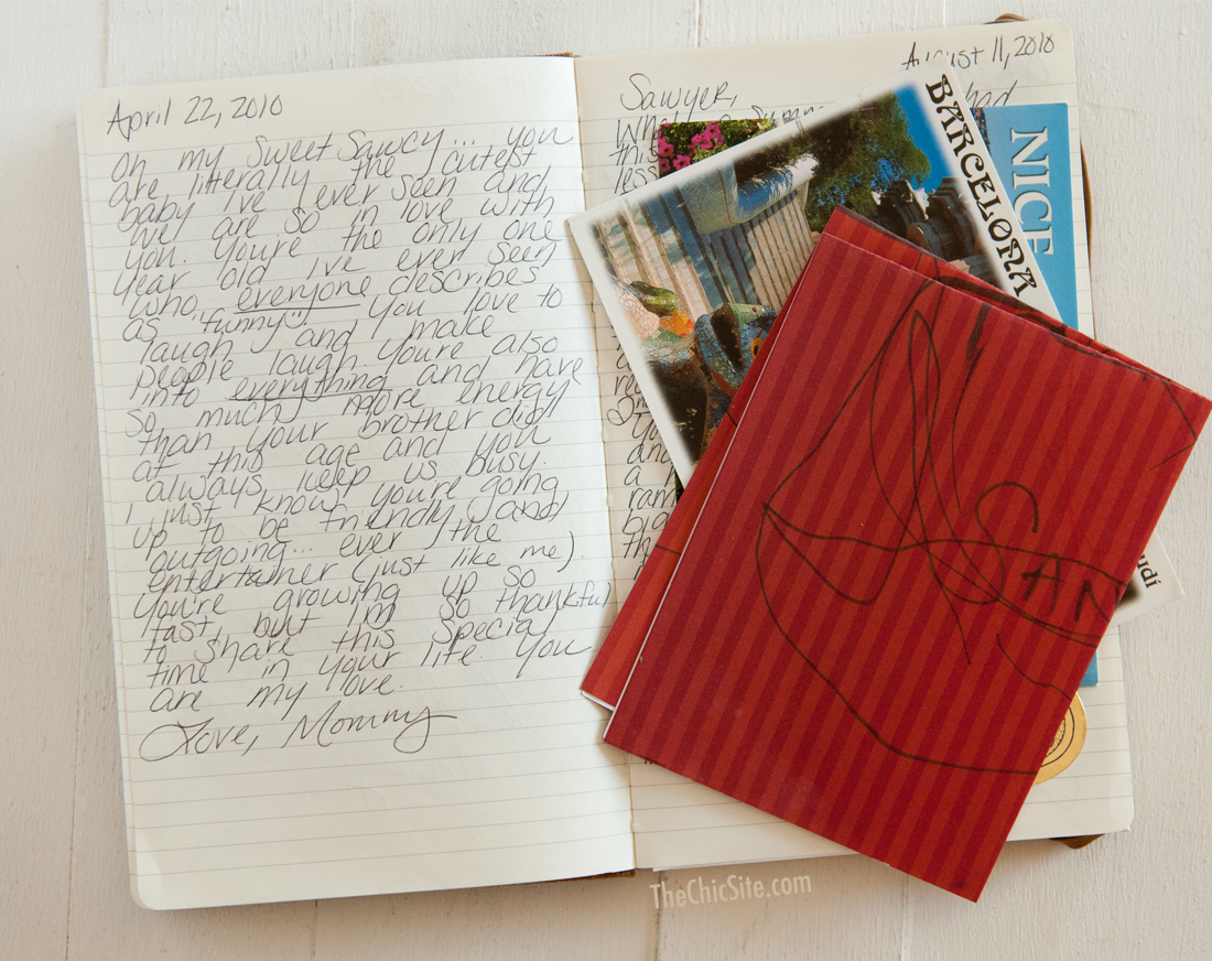 With each new son I have gone out and purchased a new journal. I keep them on my nightstand and I write whenever something big happens in their life or in the world. I try not to write in them all on the same day (because then I worry I’ll say the same thing to each) but I usually talk about how old they are and what they’re like at this age. I’ve also included big world events and what my perspective was on each. I hope it gives them a neat perspective on my own life as well as theirs.