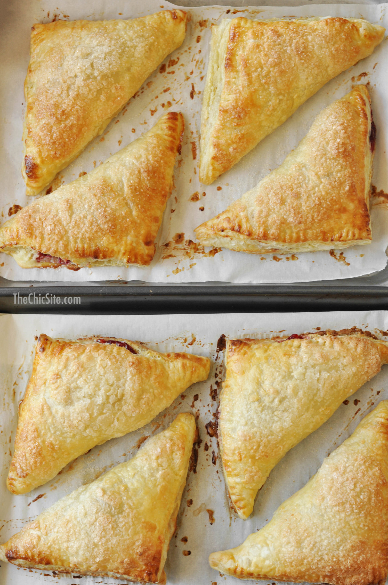 - Brush the turnovers liberally with an egg wash (egg whisked with a splash of water) and sprinkle with granulated sugar. Bake for about 20 to 25 minutes or until golden brown and flaky. Allow to cool slightly. Serve warm and enjoy!