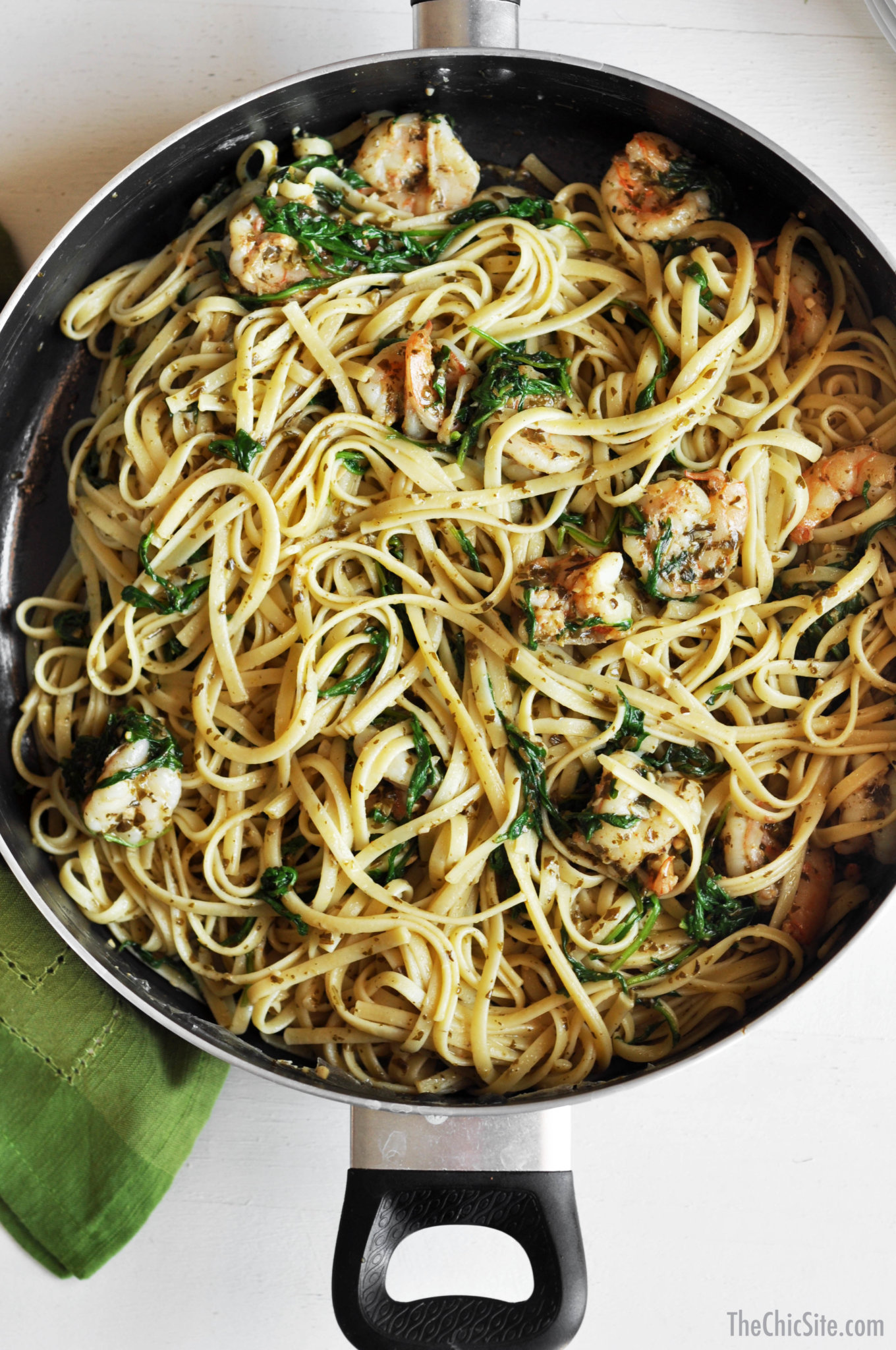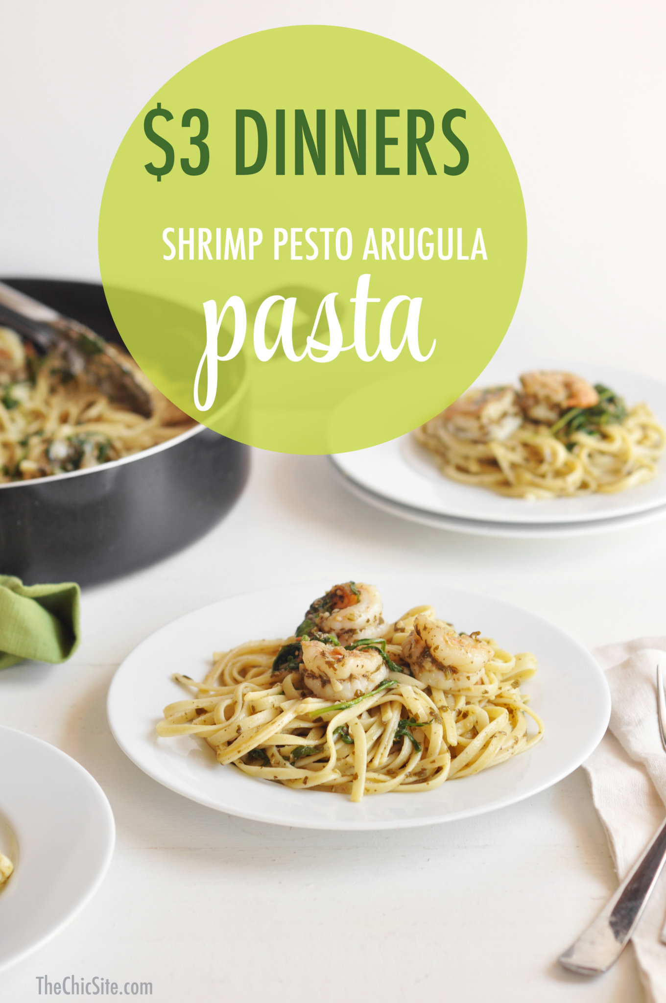 We’re always on the run, never having enough time to make a meal for our families. Let’s not even talk about the fact that going to the grocery store can be pretty pricey. Our Chic $3 Dinners are meant to make feeding your family tastier and less expensive! This shrimp pesto arugula pasta is not only delicious, but it’s easy to make. With only a handful of ingredients, you’ll have it on the table in half an hour or less!