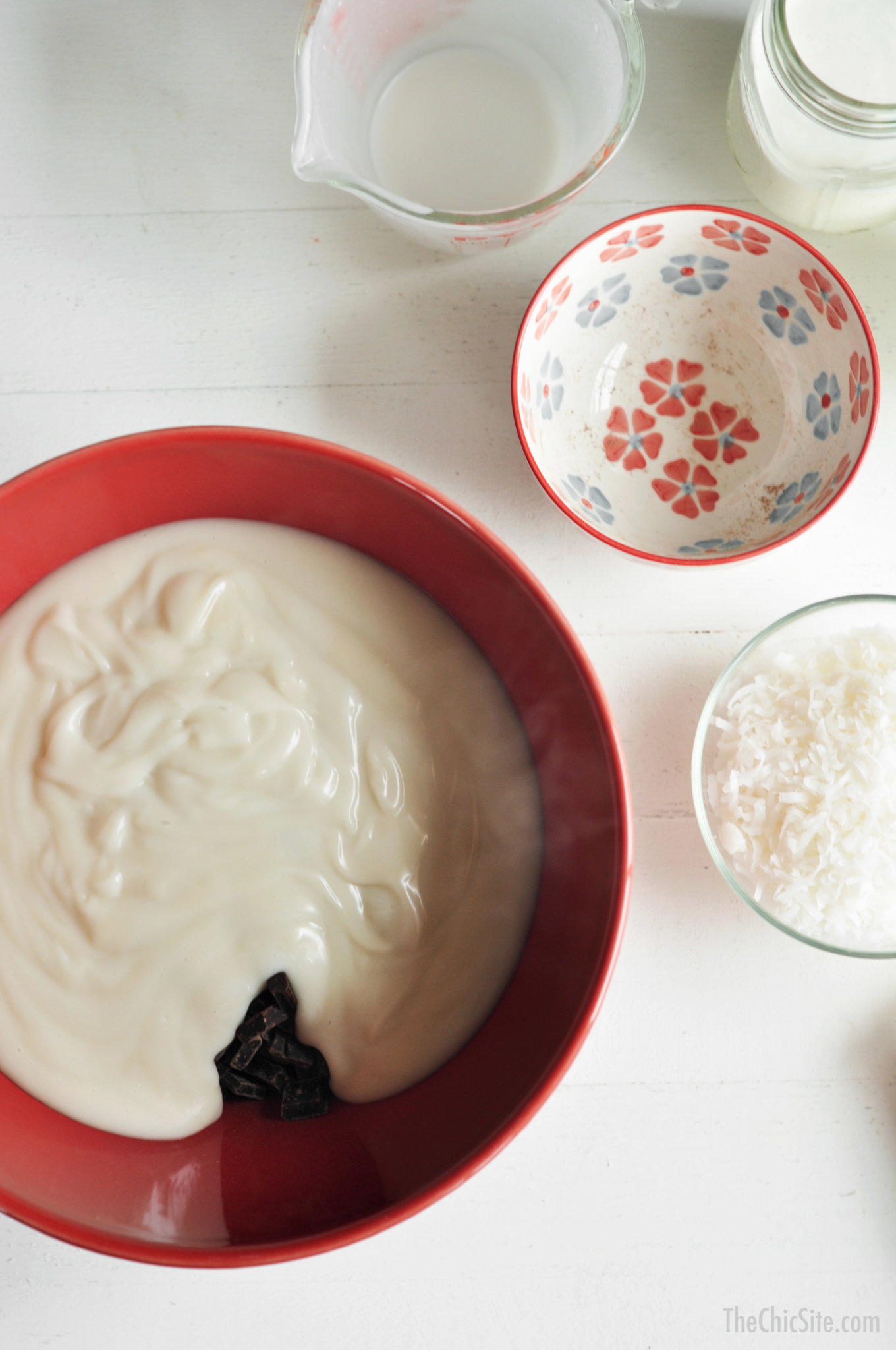 Place the dark chocolate chips in a large bowl and then pour the thicken coconut milk mixture directly over the chocolate.