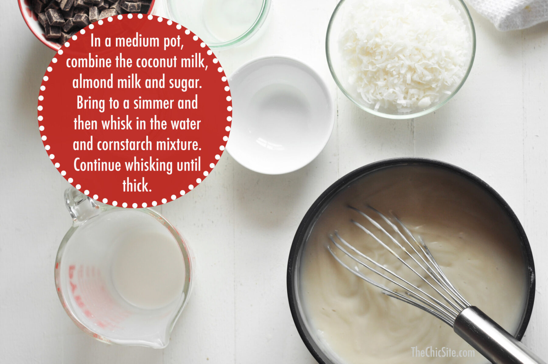 - To make the filling, in a small bowl whisk together the cornstarch and water until completely dissolved. Set aside. In a large pot set over medium heat, combine the coconut milk, almond milk and sugar. Bring to a simmer and then slowly pour in the cornstarch water mixture while whisking. Continue whisking and cooking over low until thick. Pour the chocolate chips into a large bowl, and then add the hot thickened milk over the chocolate. Allow to sit for about 5 minutes, without touching. It’ll start to melt the chocolate. Whisk until completely melted and smooth.