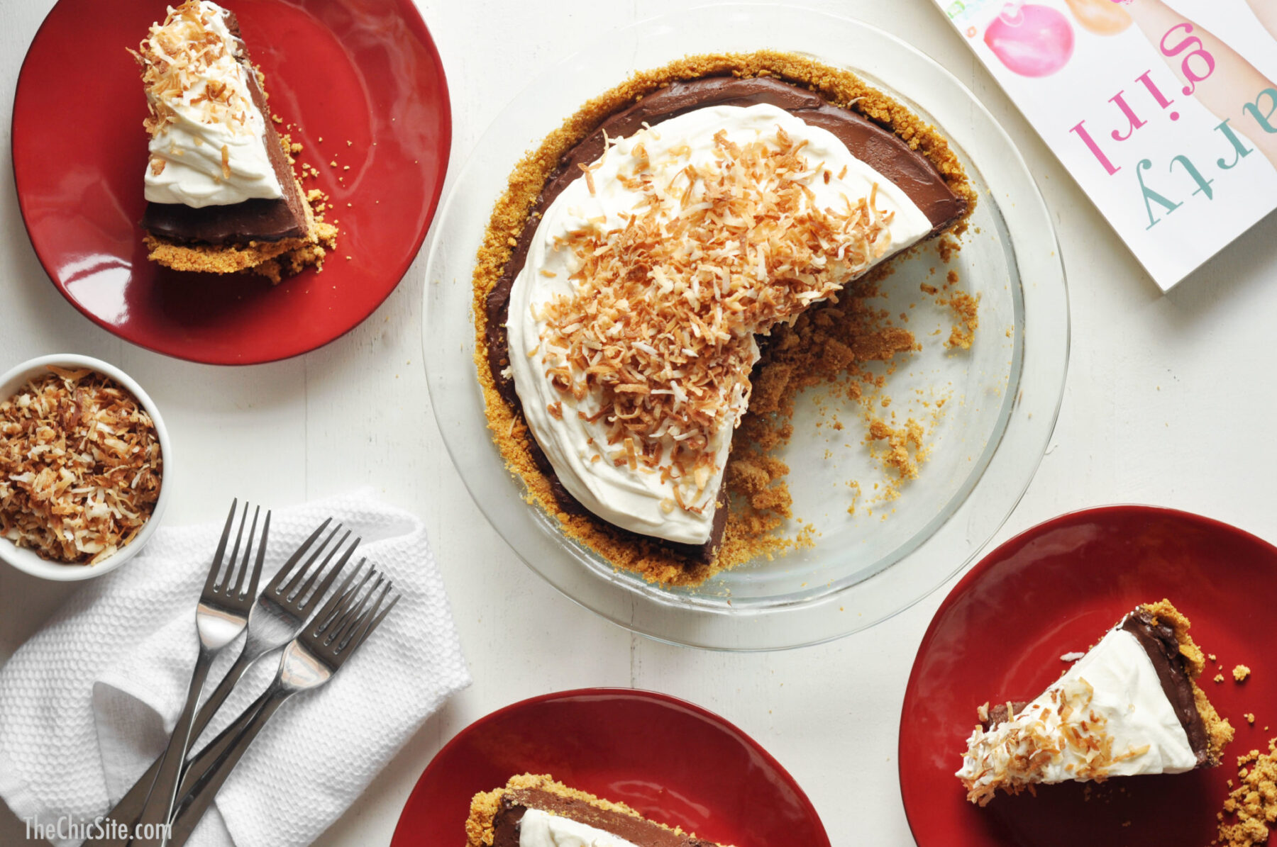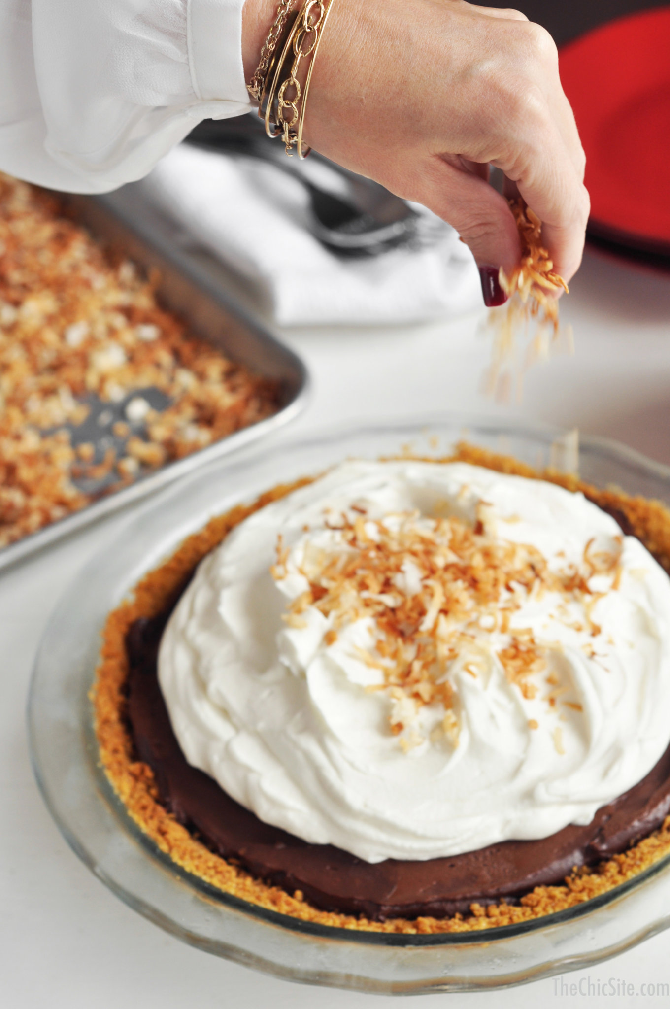 Seriously, the coolest thing about this pie is the fact that I totally made it up in my head. I mean, obviously I’ve dreamed up recipes before on this site but this wasn’t like that. I didn’t make this recipe up for the site, it was one I made up for my book, Party Girl. I was writing a scene about Thanksgiving and I wanted to hint at the fact that the character had secret baking skills (her book comes out in May and she’s a pastry chef, surprise!) and so I typed out Chocolate Cream Pie. When I edited it later I thought it wasn’t quite interesting enough so I changed it to Chocolate Coconut Cream Pie without actually checking to see if that was a real recipe. With the release of the book this week I wanted to do a recipe themed to the book and so I asked Jonathan to make my dreams of a Chocolate Coconut Cream Pie into a reality and boy did he ever. This pie is last-meal good. Each ingredient adds it’s own unique flavor but they all work together to make something magic… kind of like the characters in my book. 😉 xo, Rachel