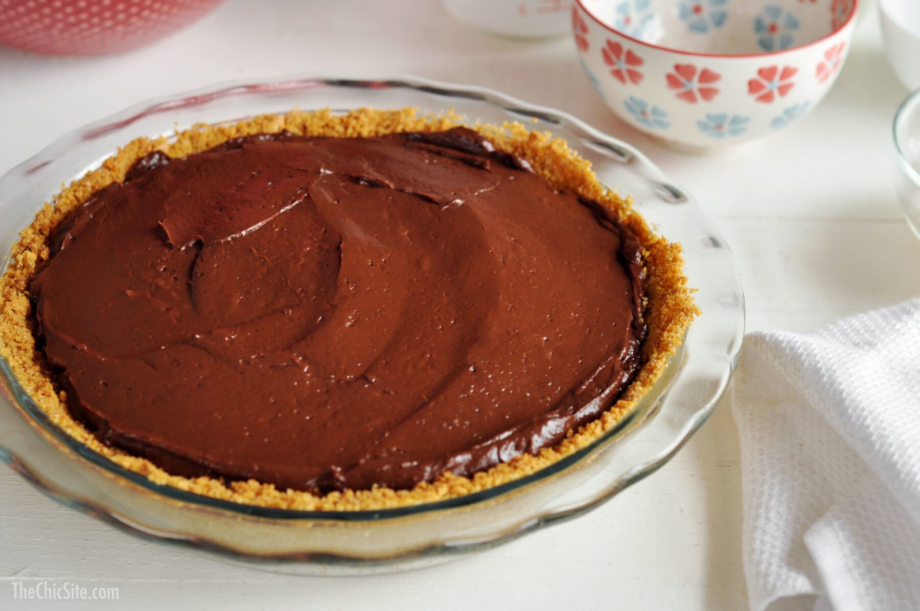 - Pour the chocolate filling into the prepared cooled pie crust. Cover the top, directly with plastic wrap, making sure the plastic touches the filling. Chill in the fridge for at least 4 hours or overnight.