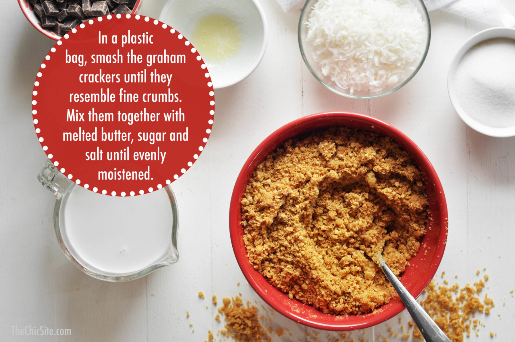 We start by making the graham cracker crust. It’s super easy to make, but if you’re in a time crunch you can skip this step and just use store bough instead.