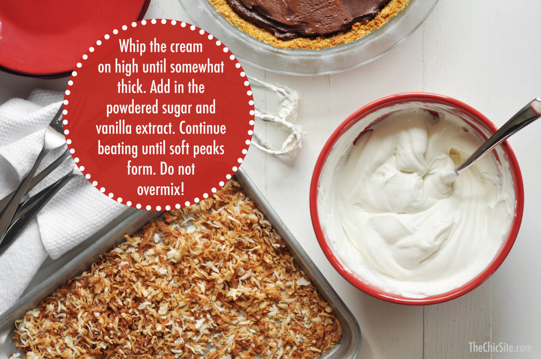 - To make the topping, beat the cream in a large bowl on high, until thickened. Add the sugar and vanilla and continue beating until soft peaks form. Do not over mix! Pour on top of the chilled pie and spread it out evenly with the back of a spoon. Top the pie with toasted coconut. Cut and enjoy! Can be wrapped and stored in the fridge until ready to serve. Pie will keep in the fridge for up to 4 days.