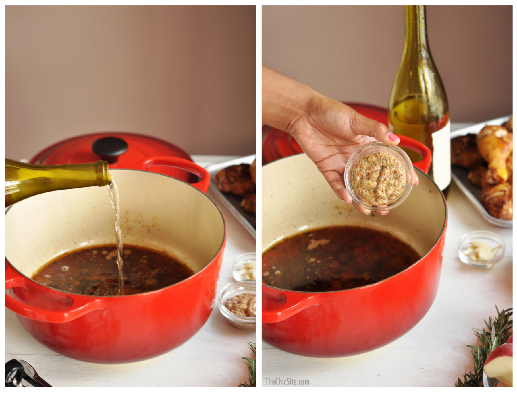 After all of the chicken has browned and you’ve transferred it to a platter, add the wine and mustard to the hot pot. This will get you going on the sauce.