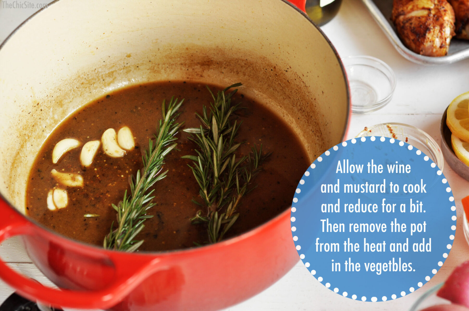 - Add the wine and mustard to the hot skillet and allow to cook down for about 3 minutes along with the rosemary and garlic. Remove from heat and toss in the vegetables. Arrange the chicken on top of the veggies.