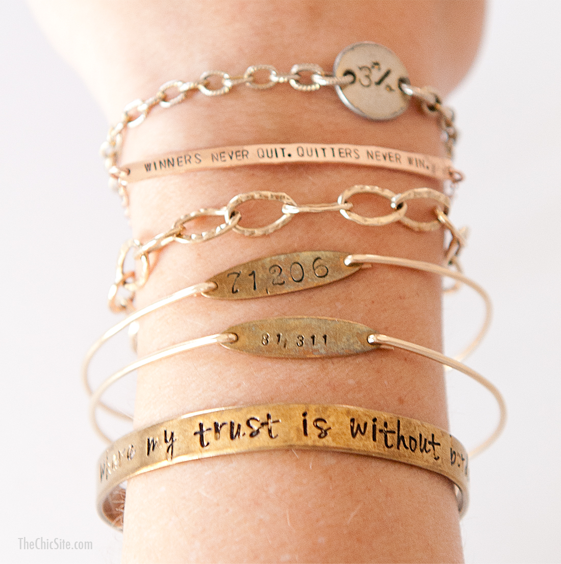 Whether it’s Instagram, Facebook or even comments on this website, there is one thing I get asked about more than any other… my bracelets. My bracelets are incredibly special to me and I never remove them (seriously, not for any reason). Basically, if I had the courage to get a tattoo I would have these things inscribed on my body, but since I don’t, I wear the sayings on my bracelets instead. So for those of you who are curious, read on to see what each one means.