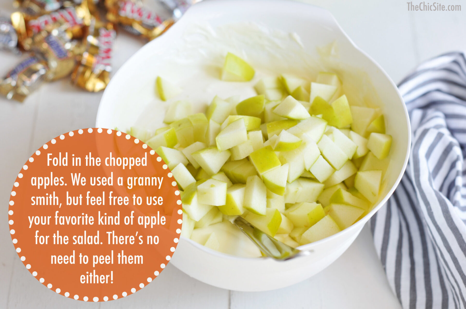 - In a large bowl, whisk together the milk and pudding mix, until completely combined and dissolved. Chill in the fridge for about 10 minutes. Fold in the thawed whipped topping. Add the chopped apples and mix until just combined.