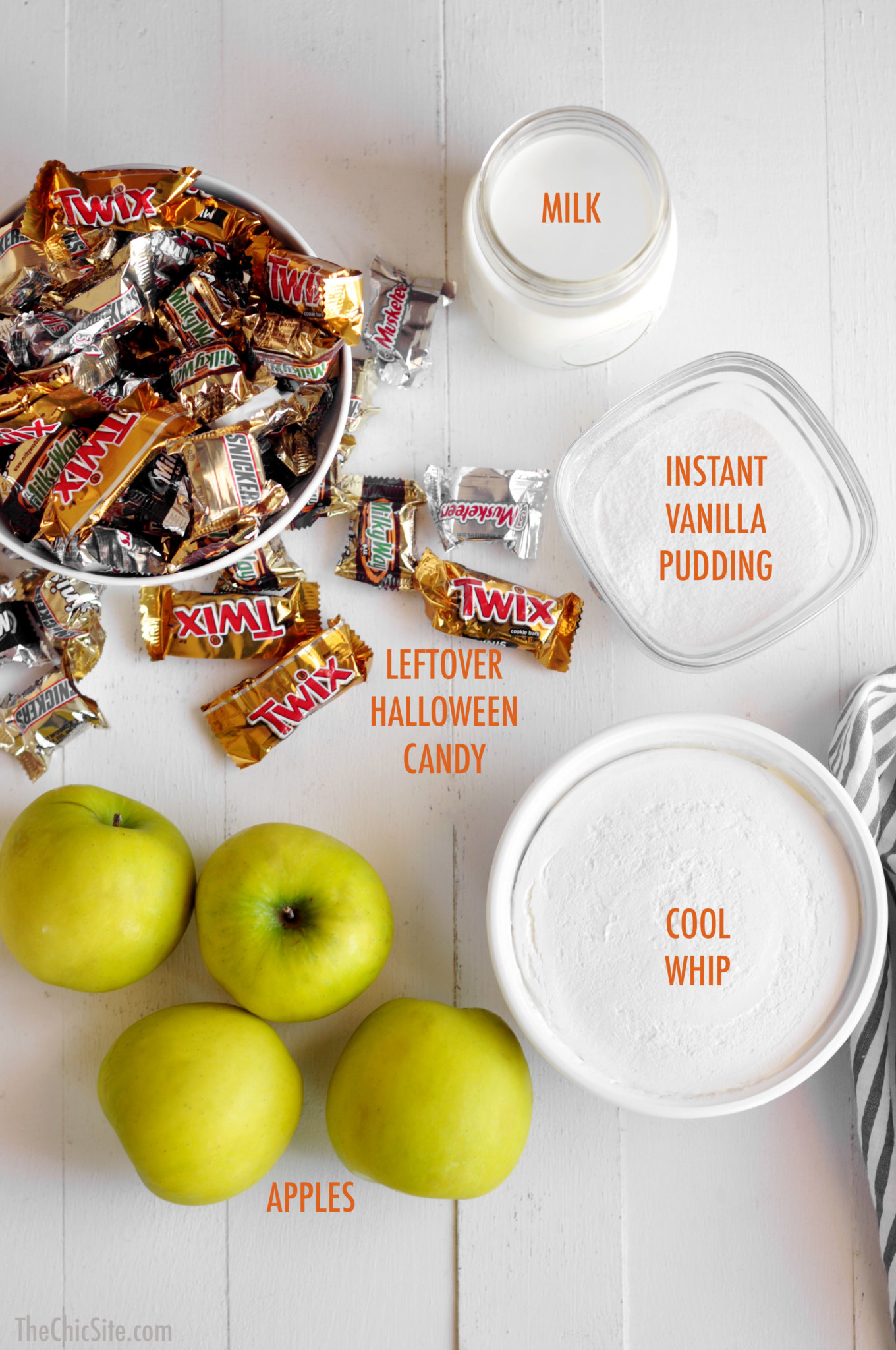 I don’t know about you, but we always have a bunch of Halloween candy leftover, and then it’s just laying around the house waiting to be eaten. Why not turn it into a dessert? This leftover halloween candy apple salad is the perfect treat to take those mini chocolate bars and combine it with chopped apples, pudding and whipped cream! It’s so easy to make as well!