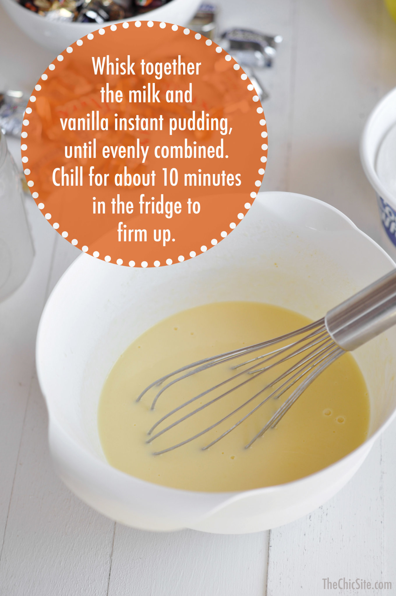 Make the instant vanilla pudding by whisking together the milk, and vanilla pudding mix. Whisk until completely combined. Then allow to chill for about 10 minutes to firm up a bit.