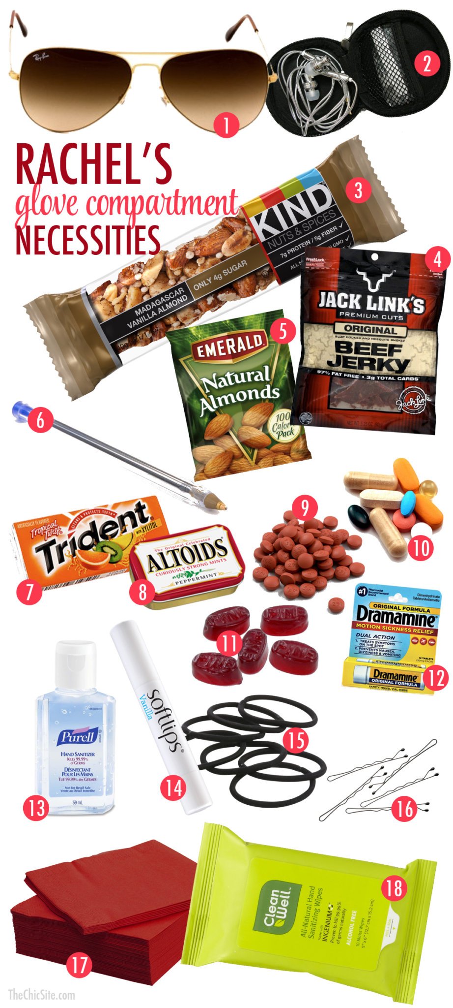 9. Ibuprofen – Or Advil or Tylenol, etc. I always have a bottle of pain medication in the car in case I get a headache while I’m on the road. I once got a really bad migraine on a plane when I had no access to any pain medicine and it was horrible. Now I always have some handy. I’m like a boy scout, I’m always prepared!