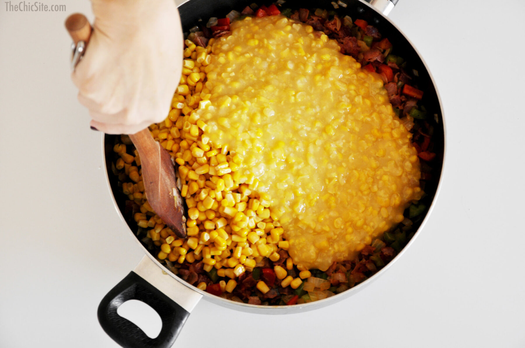 Cook veggies for about five minutes on medium heat and then you can add bacon back in. Next up comes the corn!