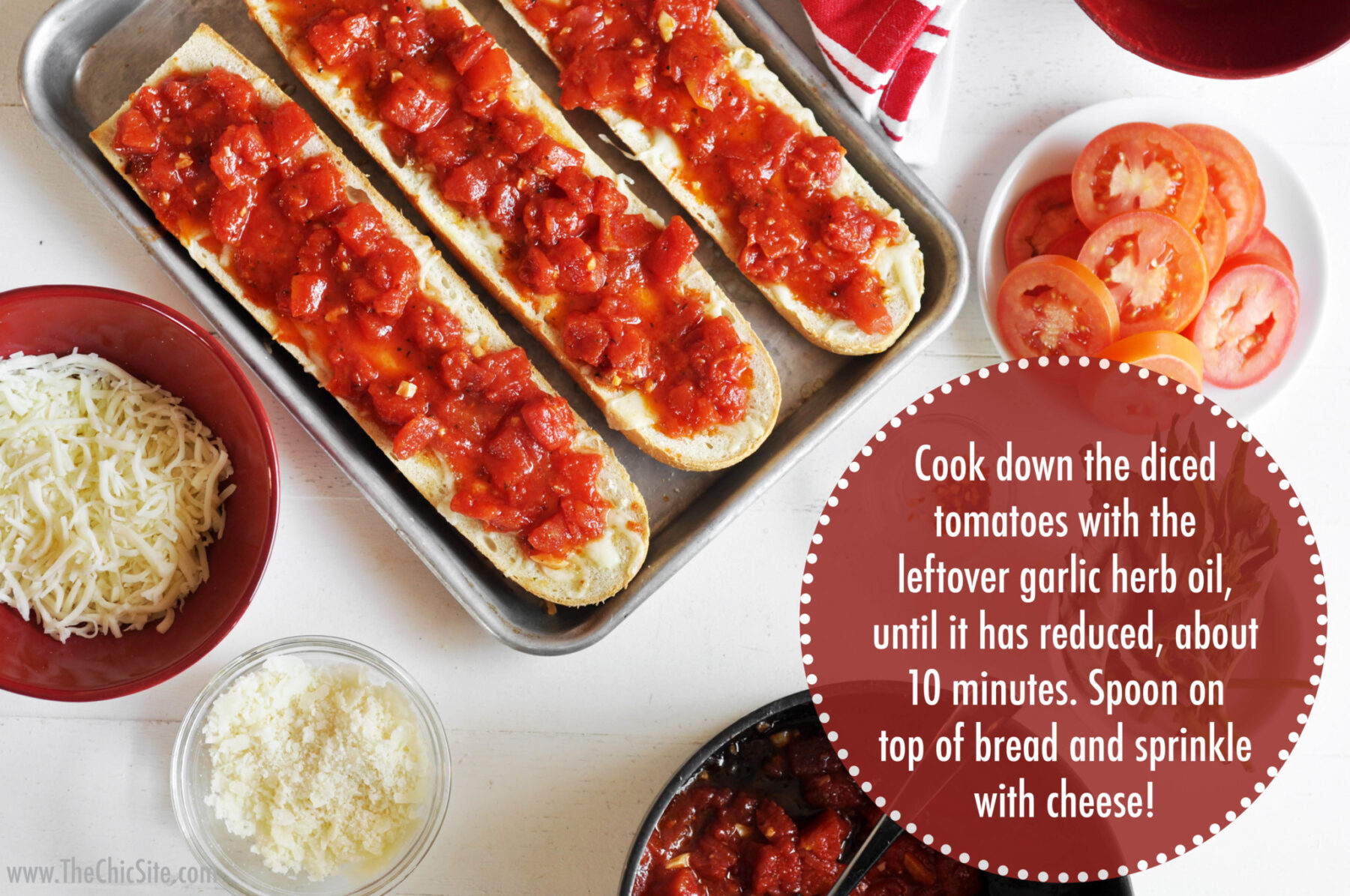 - Return the remaining garlic oil to the stove, over medium heat, and throw in the canned tomatoes. Bring to a simmer, reduce to low and cook down for about 10 minutes. Spoon the sauce over the toasted bread halves. Sprinkle each with cheeses and top with sliced tomatoes. Bake for about 10 to 15 minutes or until the cheese has melted and the bread is golden brown and crispy.