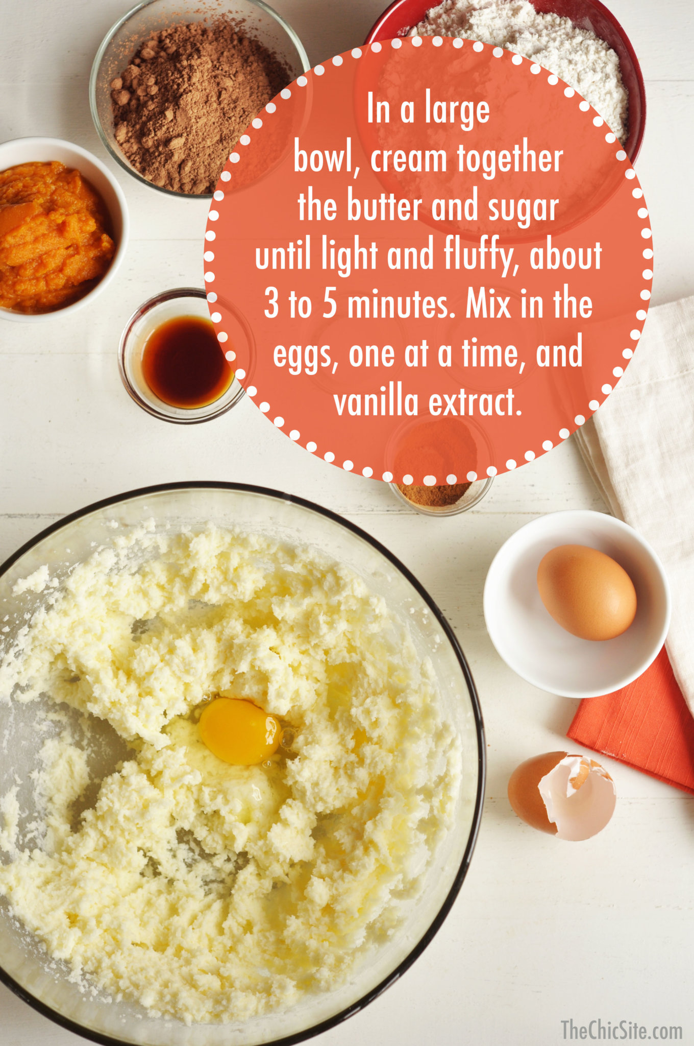 - To make the cookies: In a a large bowl, cream together the butter and sugar until light and fluffy, about 3 to 5 minutes on high. Add the eggs, one at a time, mixing well after each addition. Stir in the vanilla extract.
