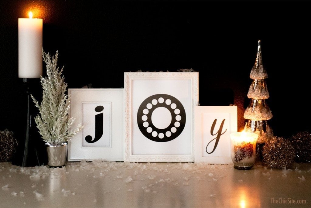I love to decorate my mantle for the holidays and I thought you might too! Get into the spirt with our FREE Joy Printable. Just print out the letters below and put them inside picture frames you already own (it will look best if all the frames match) then set them up in prominent display and style along with other festive winter elements. Happy Holidays! ~Rachel