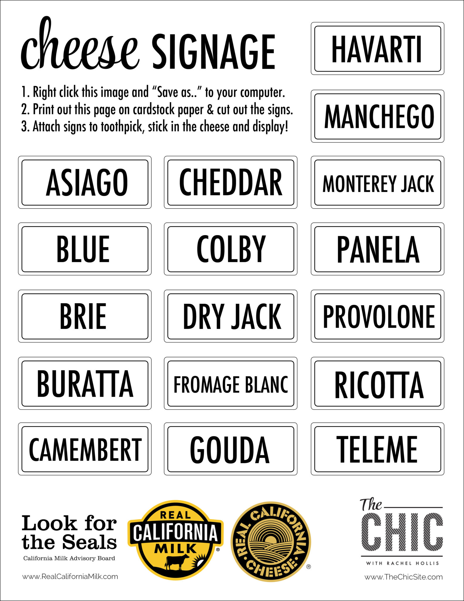 I’m sure y’all can tell by now I love cute signage and I use it in everything from Brunch to Potlucks. So you know it’s going to show up on my cheese display… otherwise, how will your guests know what you’re serving them? Use our free printable below to cut out your own then just attach it to a toothpick with a little tape.
