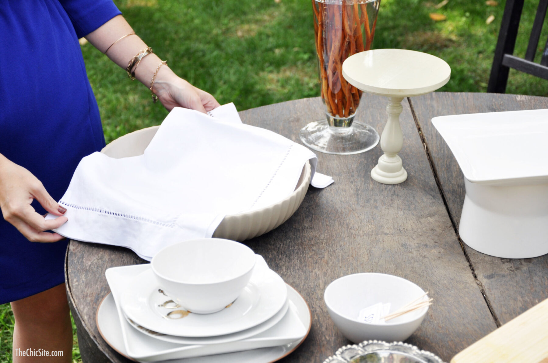 Start by gathering plates, platters and bowls to hold all your goodies. I like to use items that are in a similar color scheme so everything looks cohesive.