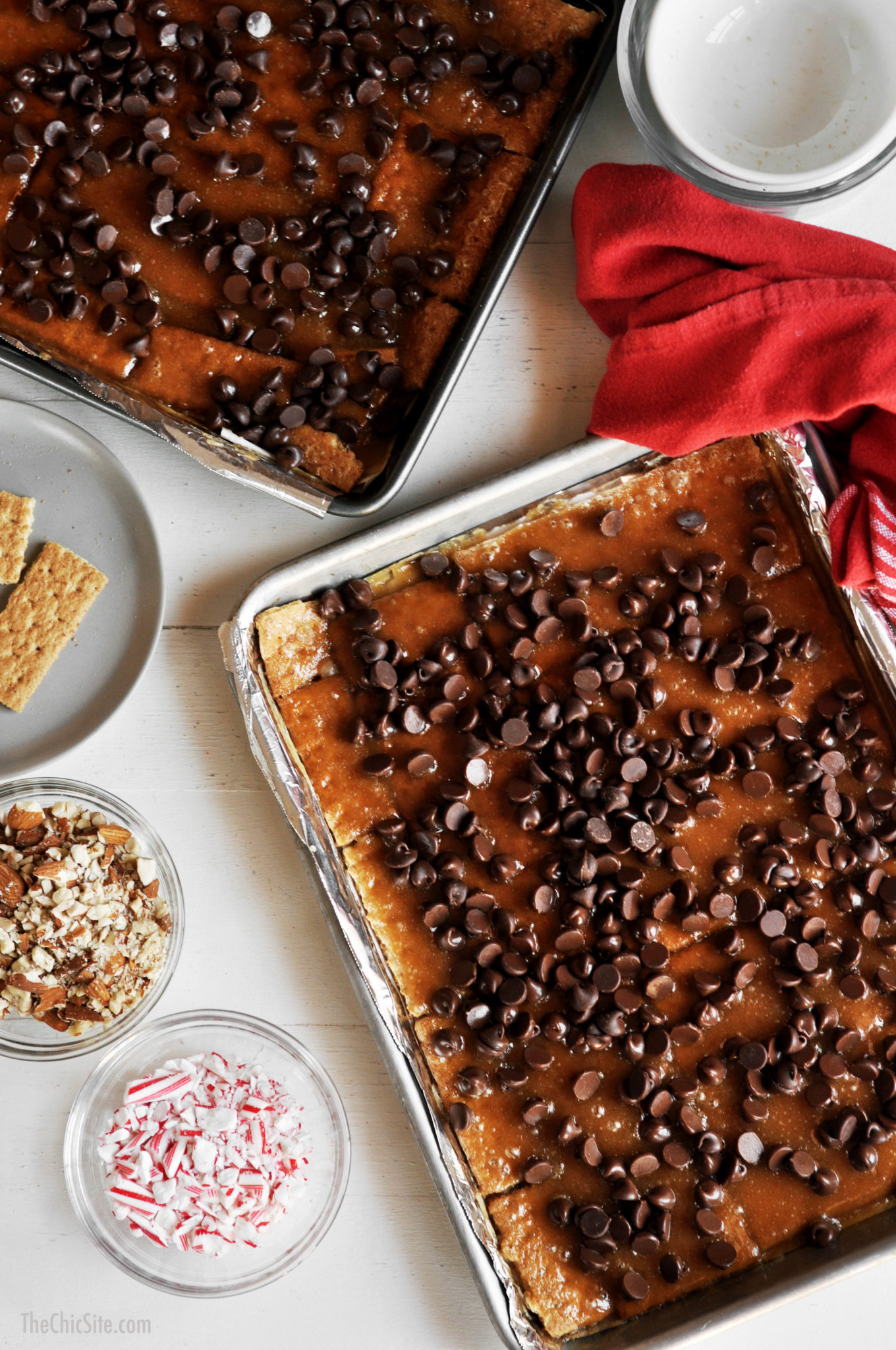 - Carefully pour the caramel over the graham crackers in the baking sheet. Spread evenly with an offset spatula. Bake for about 10 to 15 minutes until the caramel has bubbled. Remove from oven and immediately sprinkle the chocolate chips on top in an even layer. Allow to sit for about 5 minutes. The chocolate will melt from the heat. Spread the chocolate into an even layer with an offset spatula. Top with crushed almonds on one side and crushed candy canes on the other.