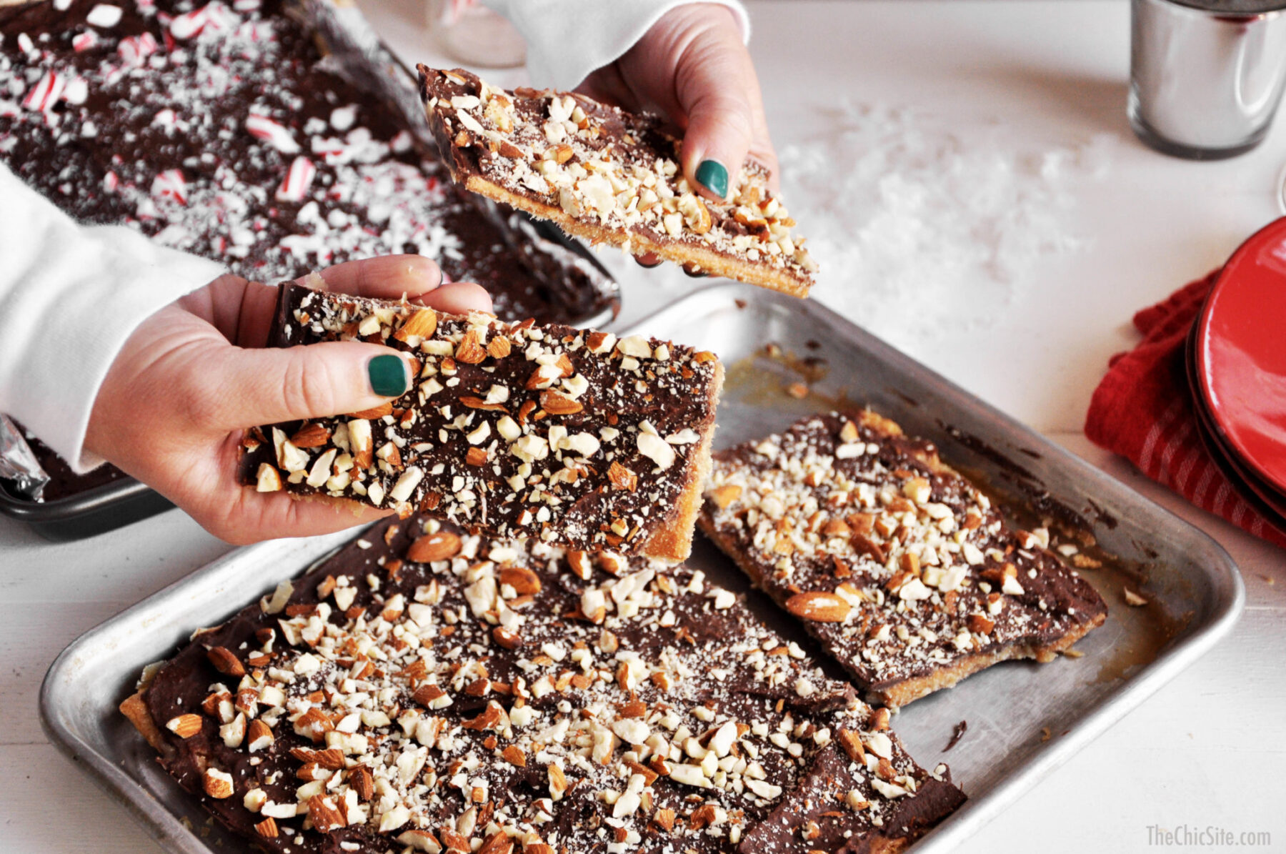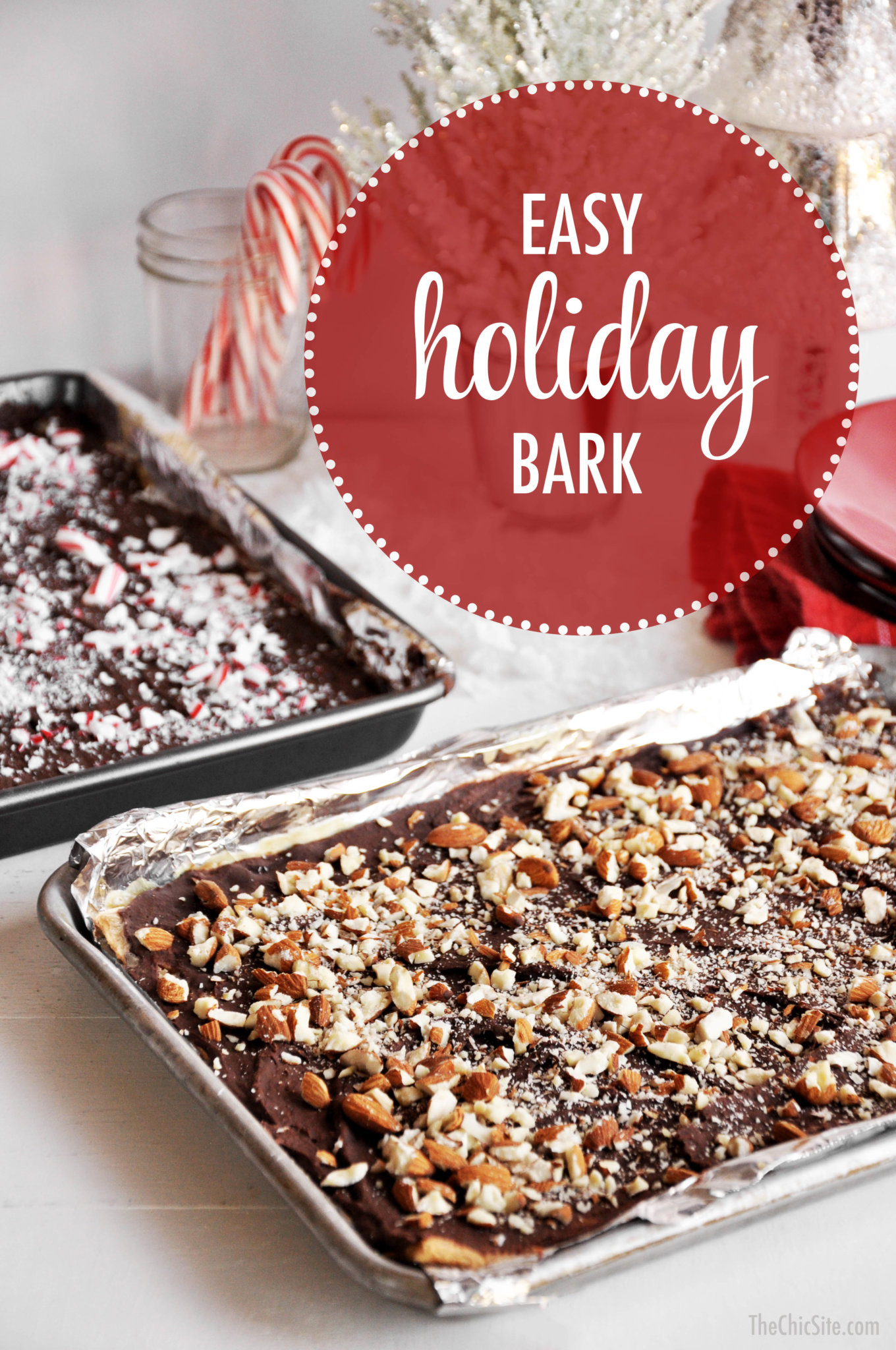 I’ve always been the kind of person that wanted to make brittle during the holidays, but I never did because it seemed too complicated. I didn’t have time to fiddle around with a candy thermometer and worry about the sugar cooking or not cooking. It’s too much. So here at The Chic we came up with an easy fool-proof way of making holiday bark! I suggest serving it with our slow cooker hot cocoa.