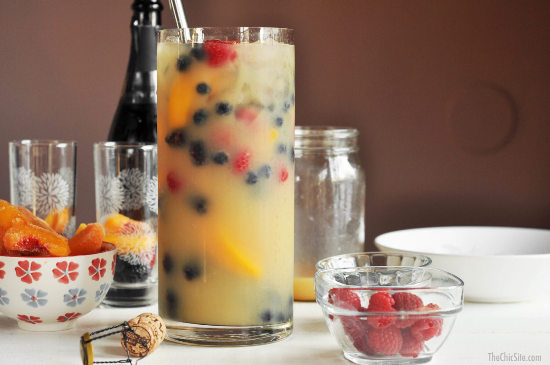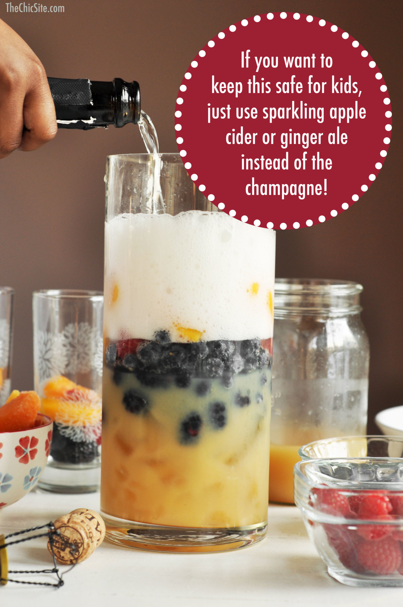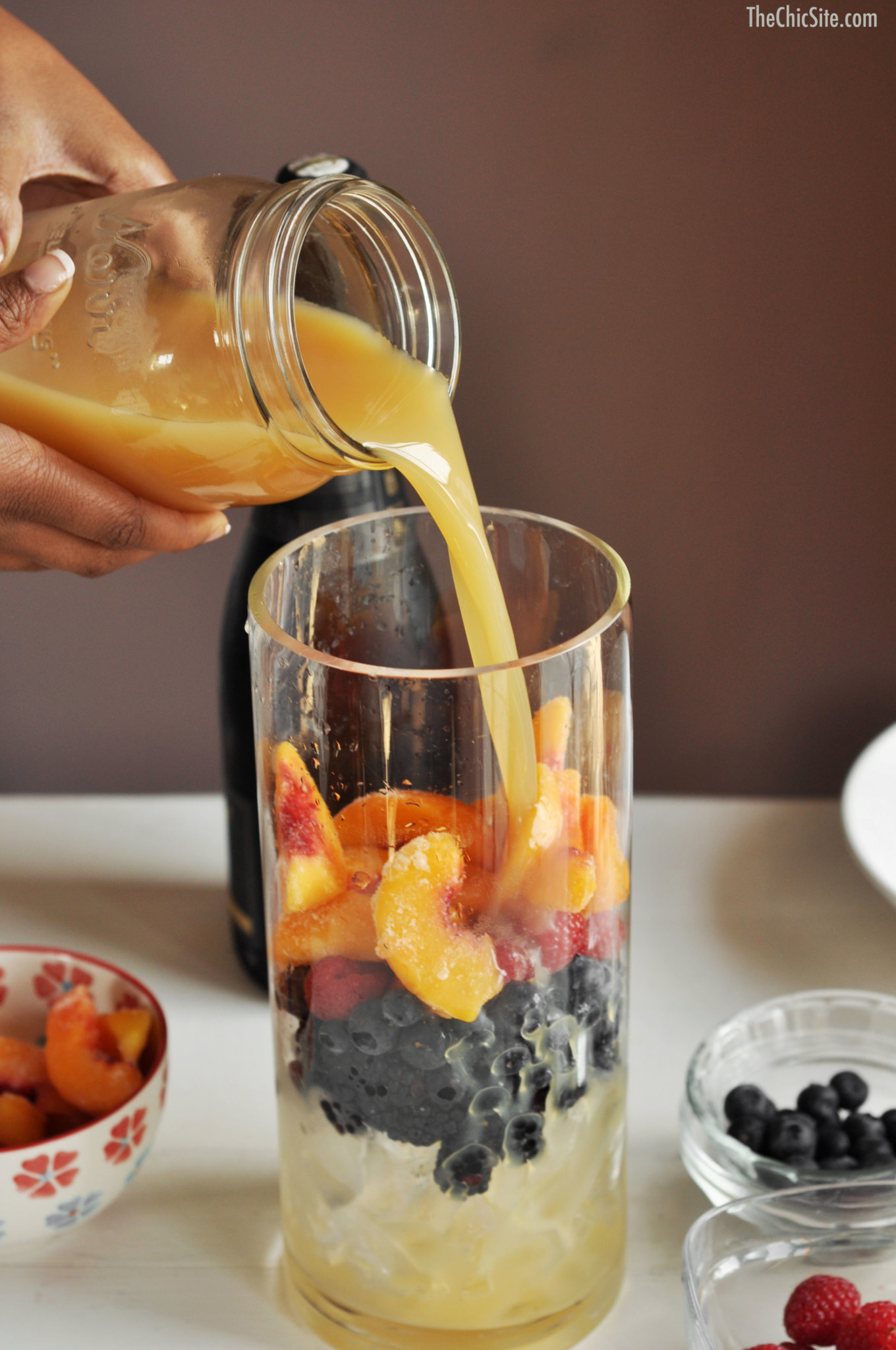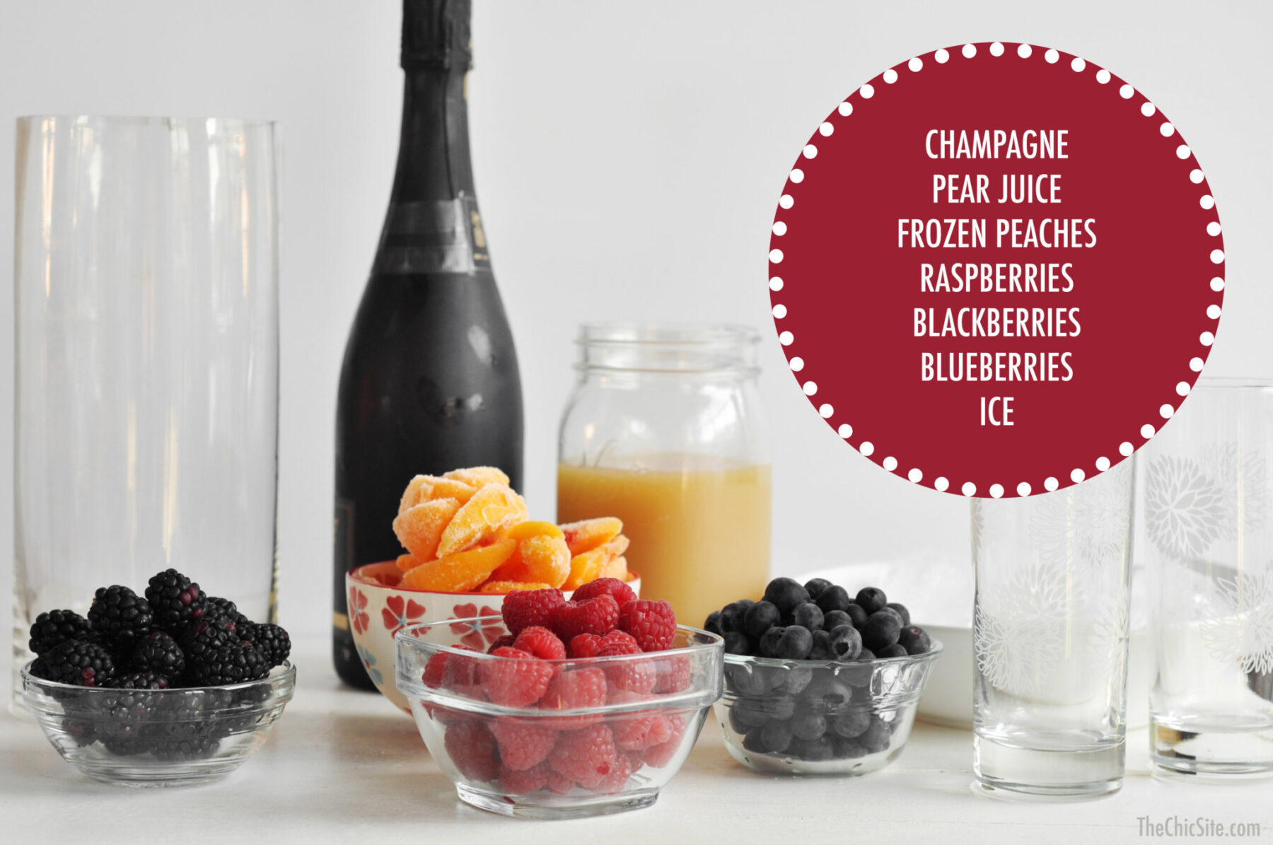 - Fill a large pitcher or punch bowl halfway with ice and frozen peaches and berries. Pour in the pear juice and top off with the bottle of champagne. Stir to evenly combine. Serve in ice filled glasses. Enjoy!