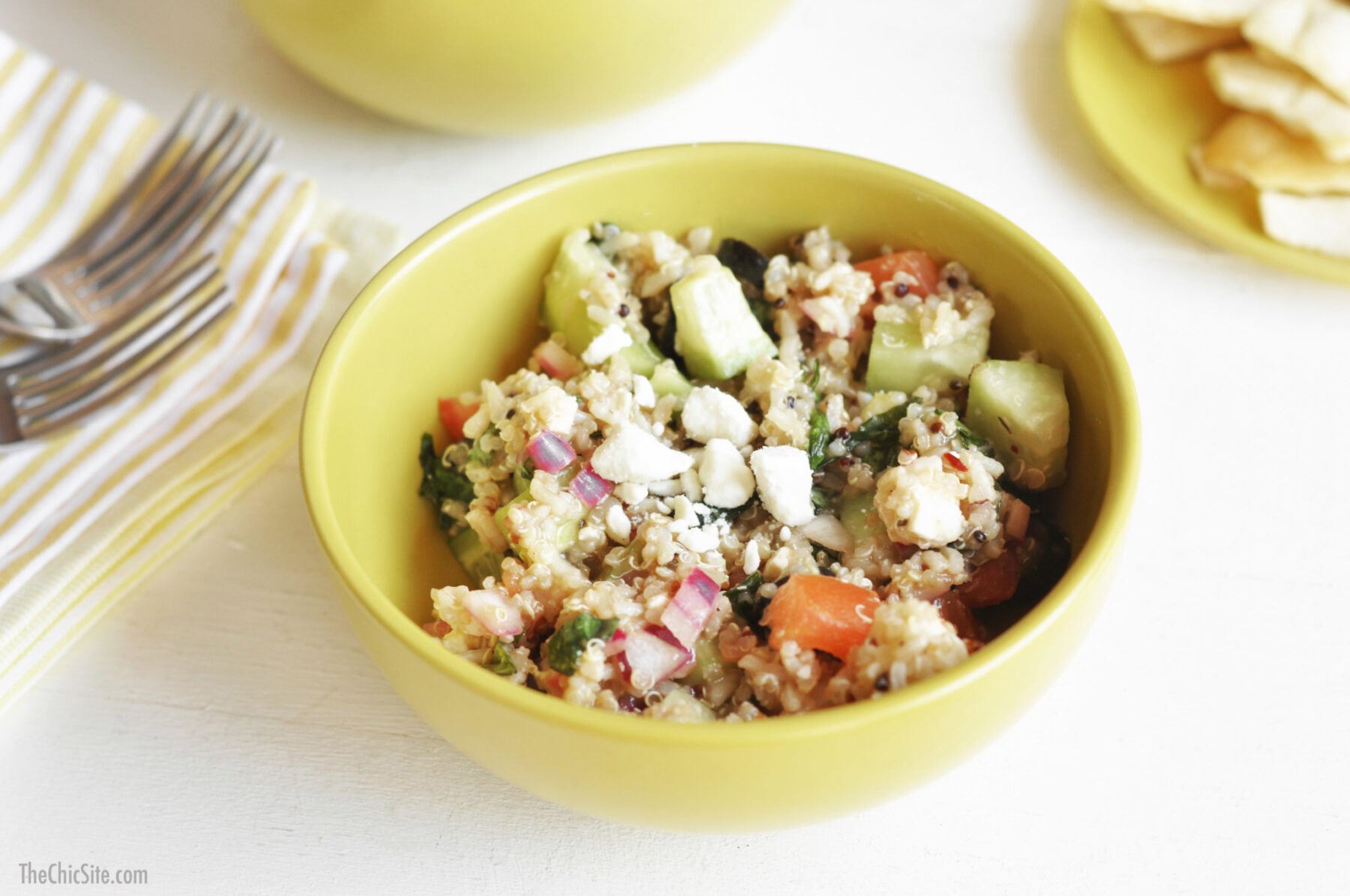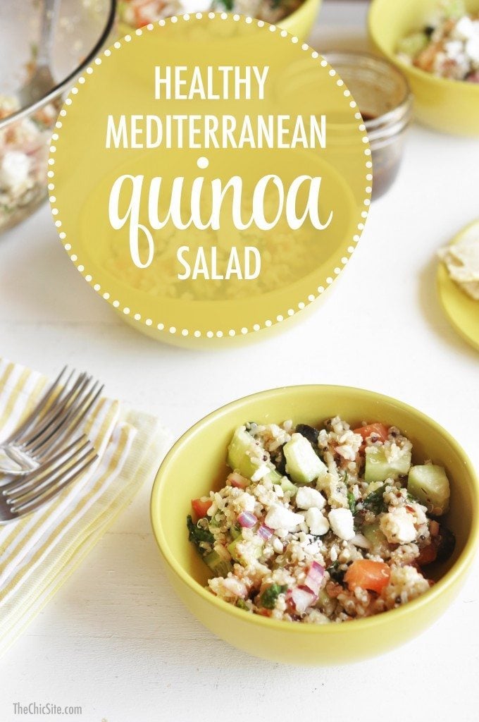 We’re keeping up with our New Year’s resolution to stay on the eating healthy track! This Mediterranean Quinoa Salad is loaded with tons of fresh veggies and it’s super easy to make! In less than 30 minutes, you’ll have a healthy vegetarian side dish that you can feel good about serving your family!