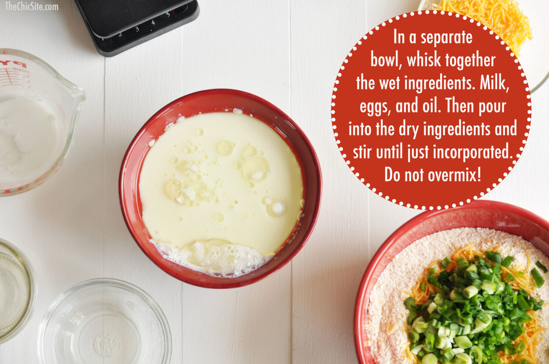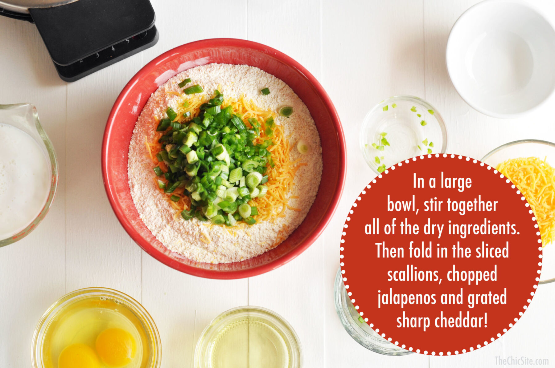 - In a large bowl combine the dry ingredients. Toss in the scallions, cheese and jalapenos. Make a well in the center of the bowl and set aside.