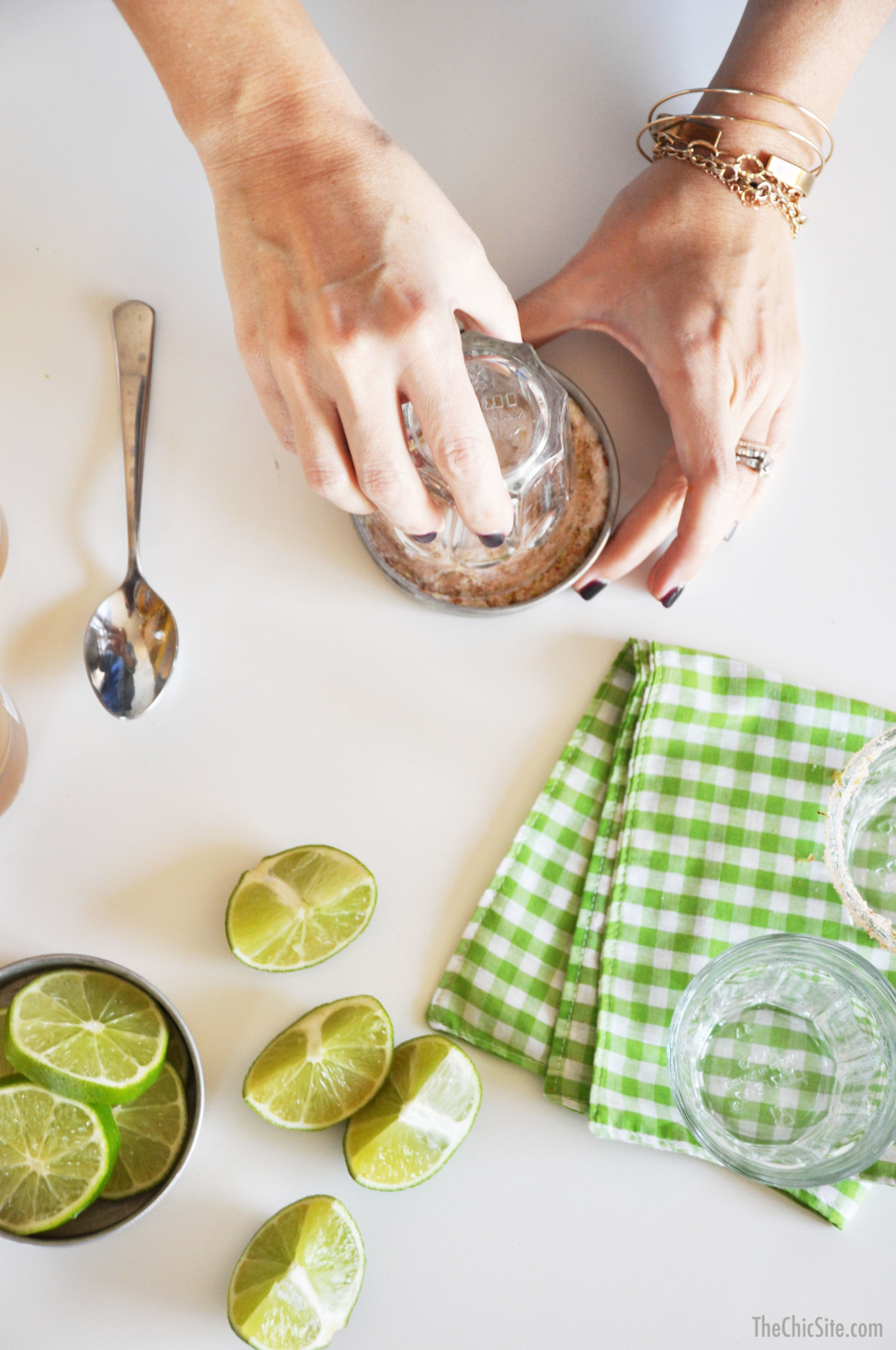 Now you can prepare your glassware. Rub a wedge of lime around the edge of the glass.