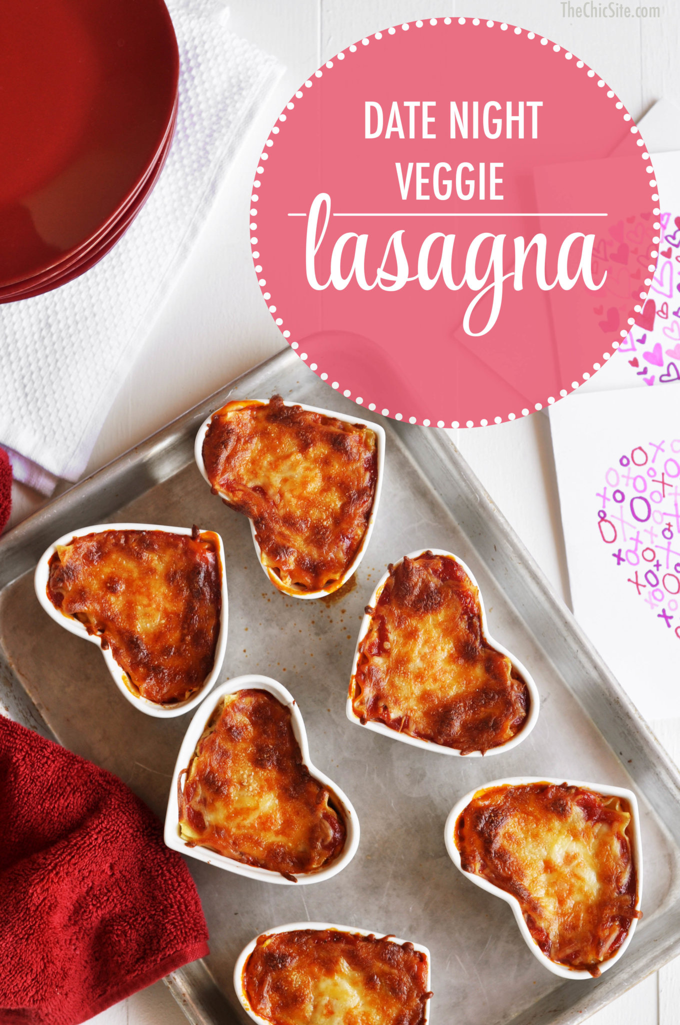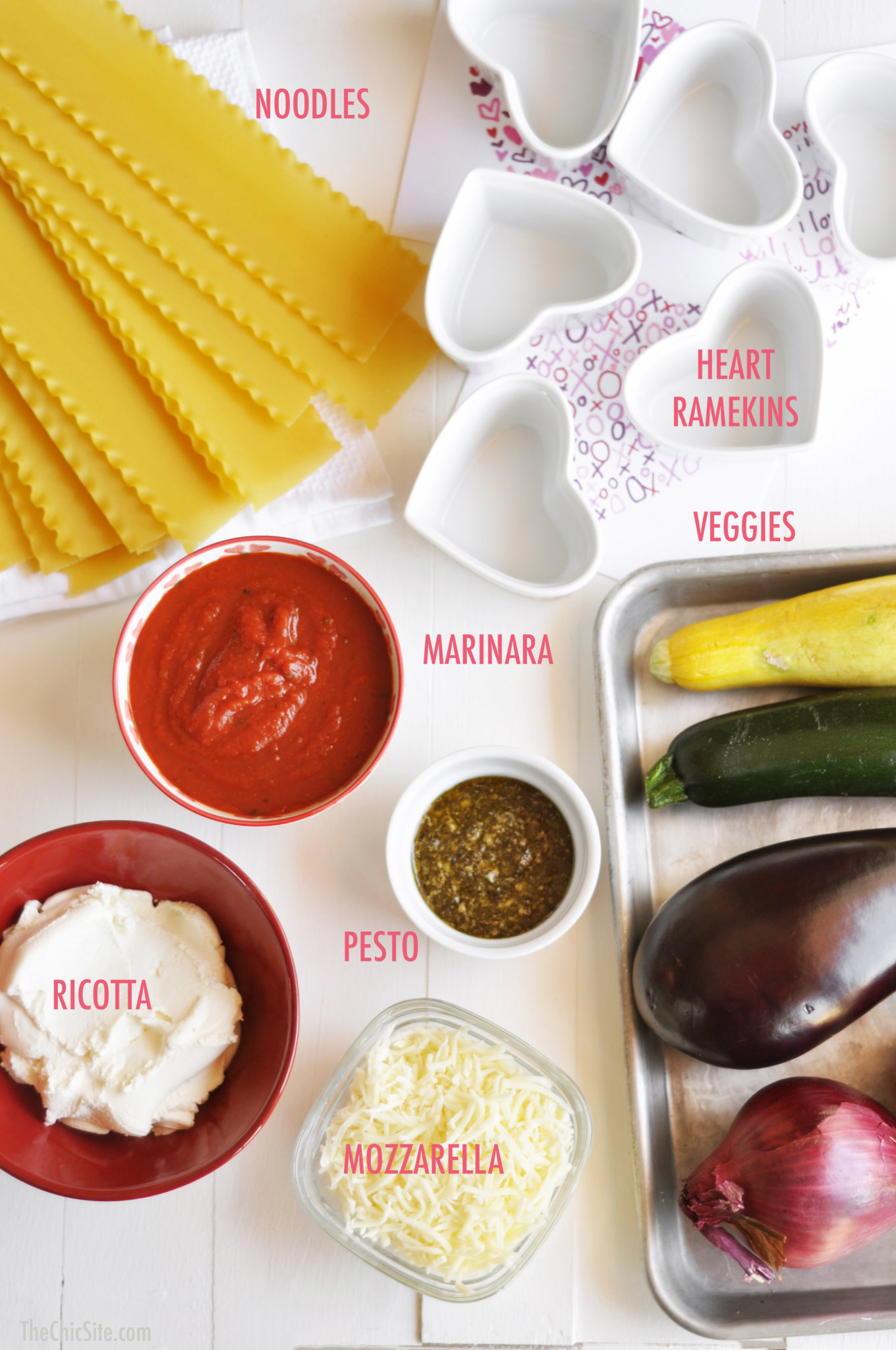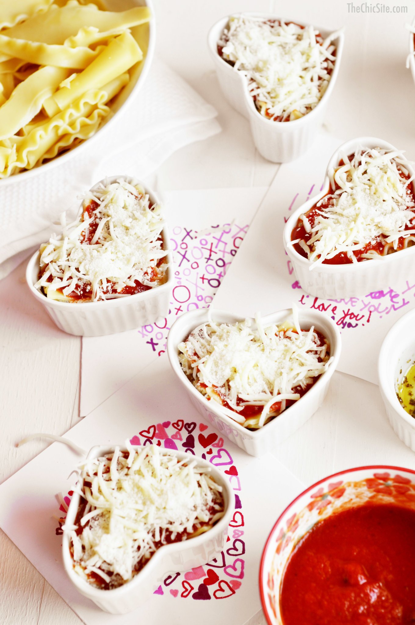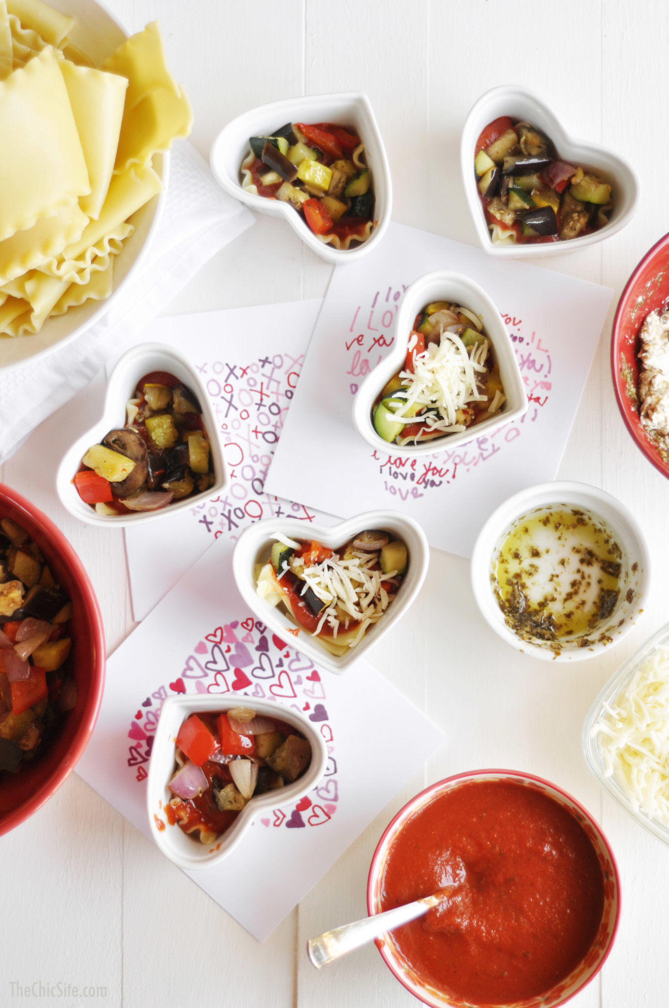 - To layer the lasagna, begin with two strips of noodles, criss crossing them into the heart ramekins to fit. Then top with marinara, veggies, shredded cheese, noodles, ricotta, noodles, marinara, and cheese to finish off. Bake in 350 degree oven for about 20 to 25 minutes or until bubbly and golden brown. Serve hot.