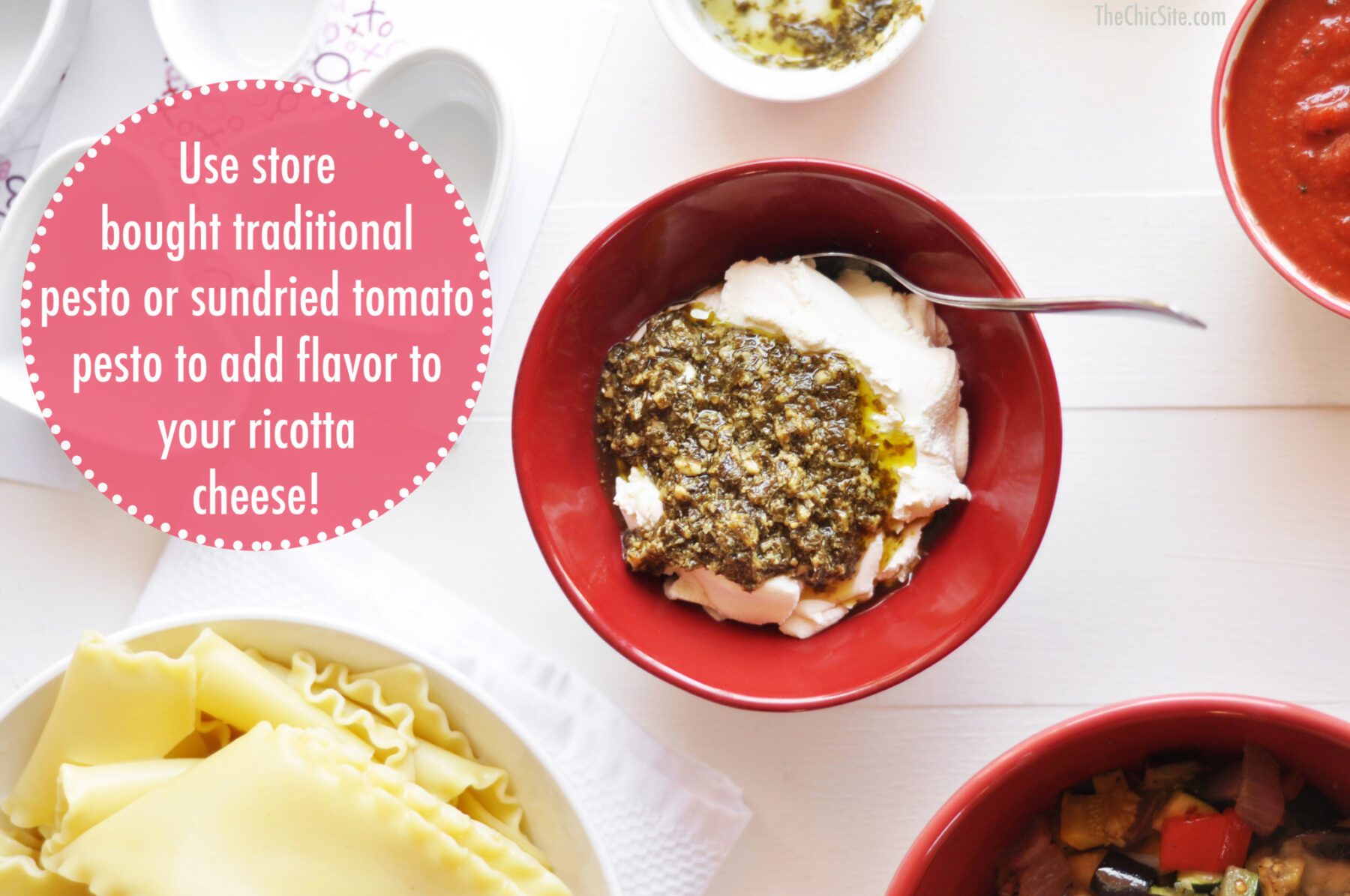 - In a small bowl, combine the ricotta and pesto until smooth. Set aside. Cut the cooked lasagna noodles into 2 inch short strips.