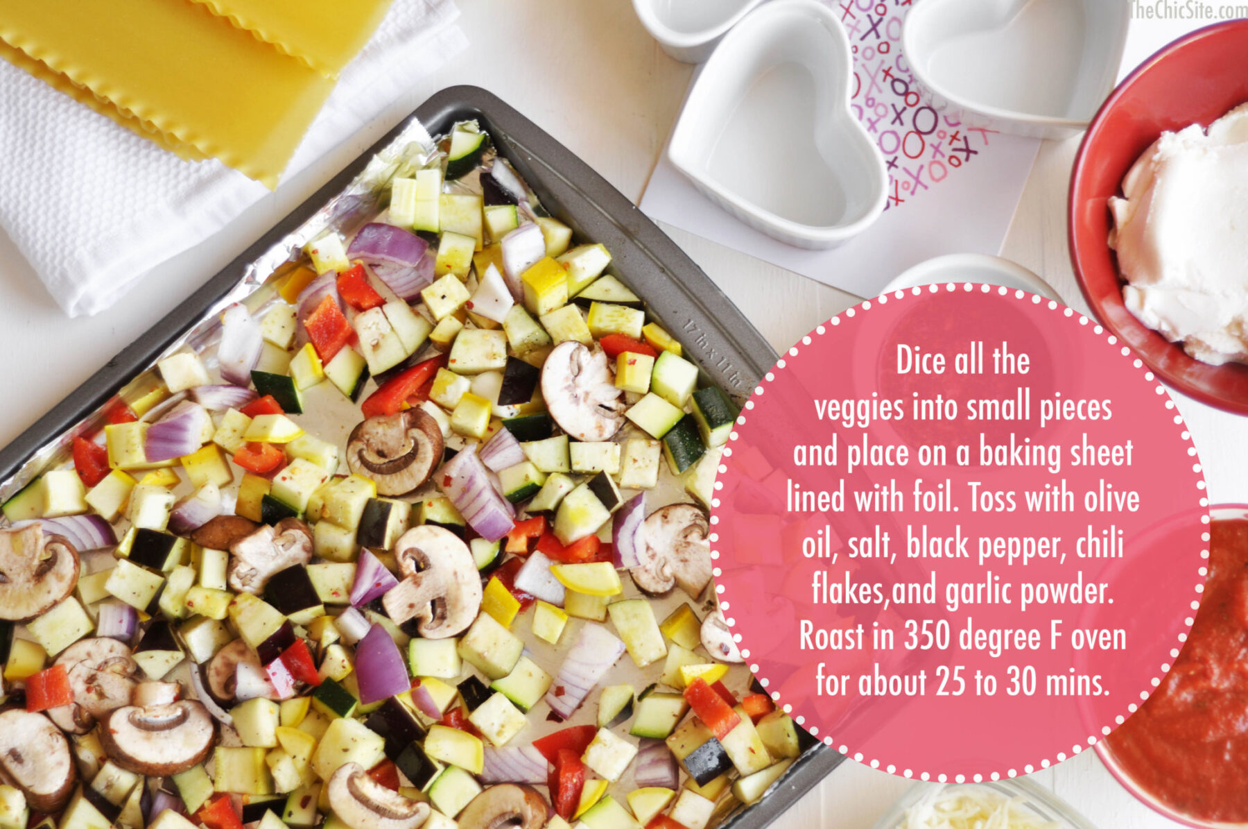 You can make this lasagna as one big pan or in round ramekins but if you want to go the extra mile and do heart shapes these are the ones we used. Start off by roasting the veggies in the oven so that they’re nice and charred for the lasagna.
