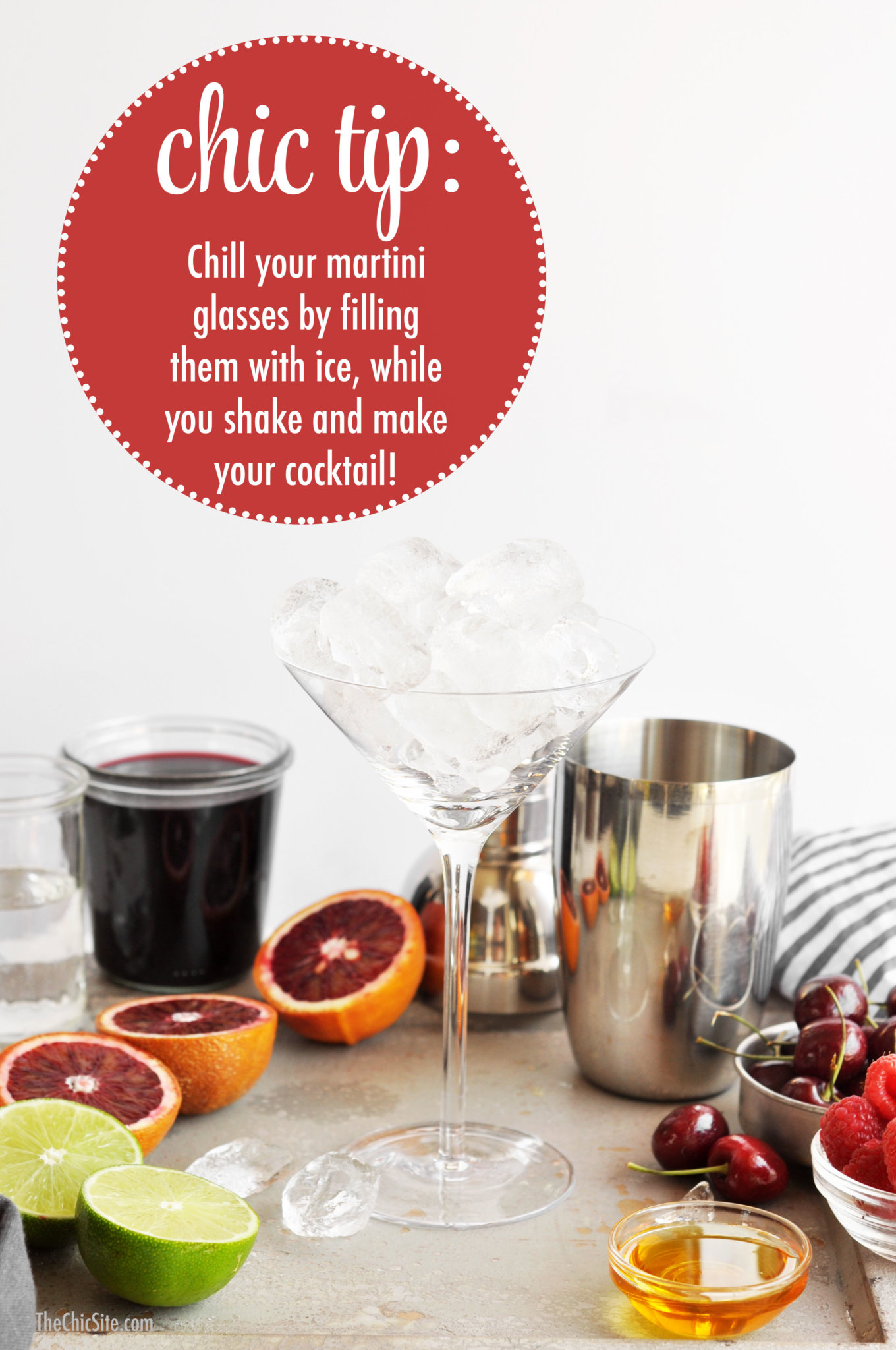 Chill the martini glasses before serving them, either by placing them in the freezer for a bit or with our Chic Tip!