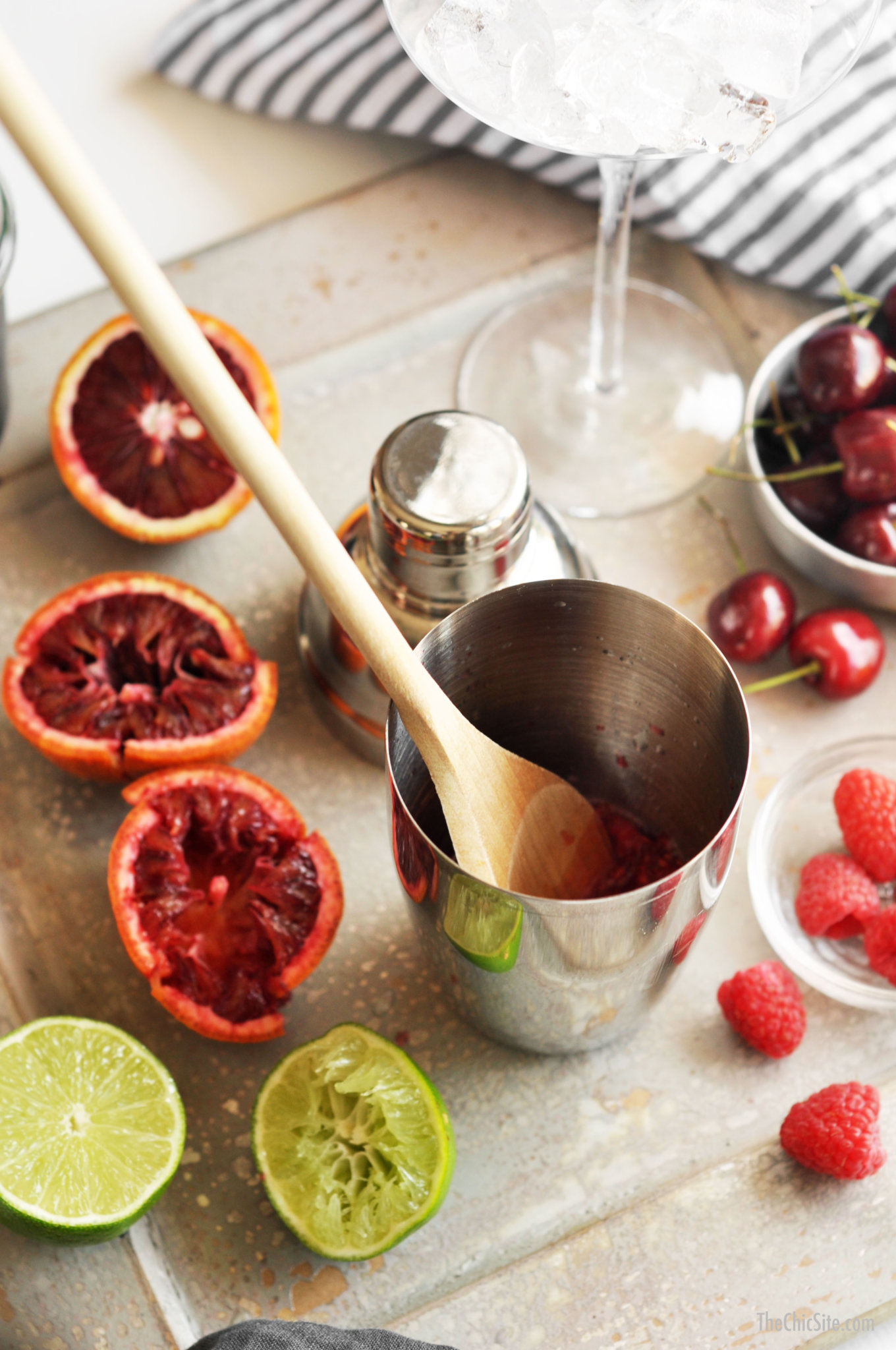Set the ice filled glasses to the side and then place a handful of raspberries into a cocktail shaker. Add the fresh squeezed lime juice and the fresh squeezed blood orange juice. If you can’t find fresh blood oranges at the grocery store, a regular orange or tangerine will work just fine.