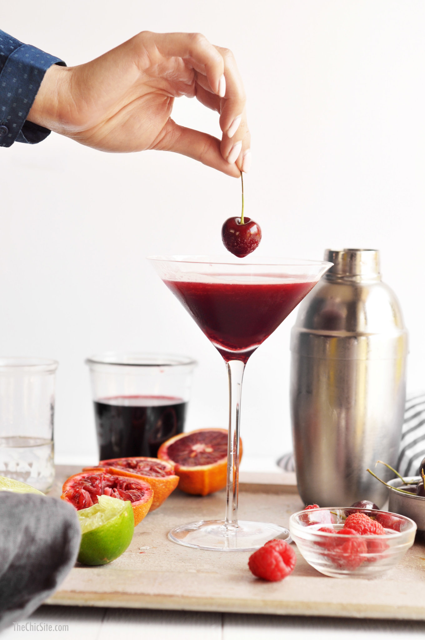 - Place the raspberries, lime juice, and blood orange juice in a cocktail shaker. Using a muddler or wooden spoon, smash the raspberries to release all of their juice. Pour in the agave, vodka, and cherry juice. Fill with ice and cover tightly with lid. Shake vigorously for about 30 seconds to fully combine and chill. Pour the cocktail into a chilled martini glass. Garnish with a fresh cherry before serving.