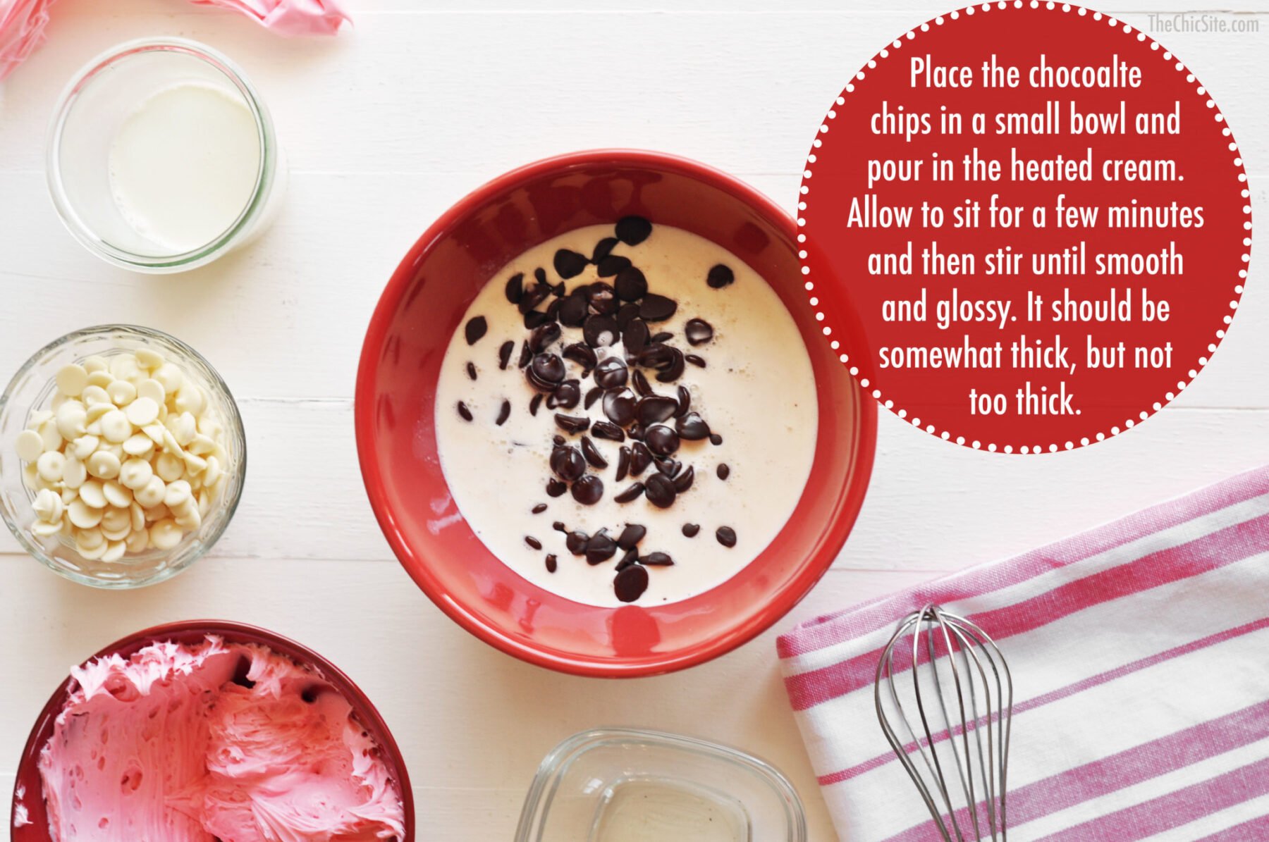 - Place the semi-sweet chocolate chips into a medium bowl and pour the hot cream over it. Allow to sit, untouched, for about 3 minutes and then stir until melted, and glossy. Dip the chilled cupcakes into the ganache. Drizzle with melted white chocolate. Store in fridge and serve cold or at room temperature.