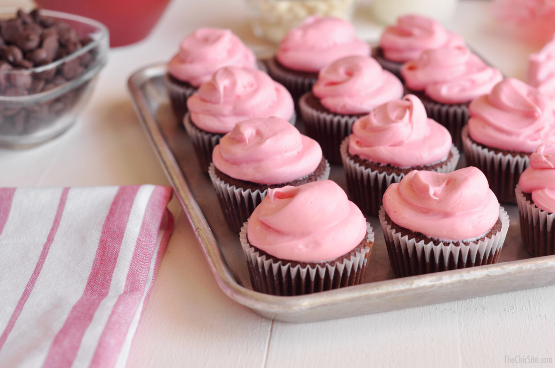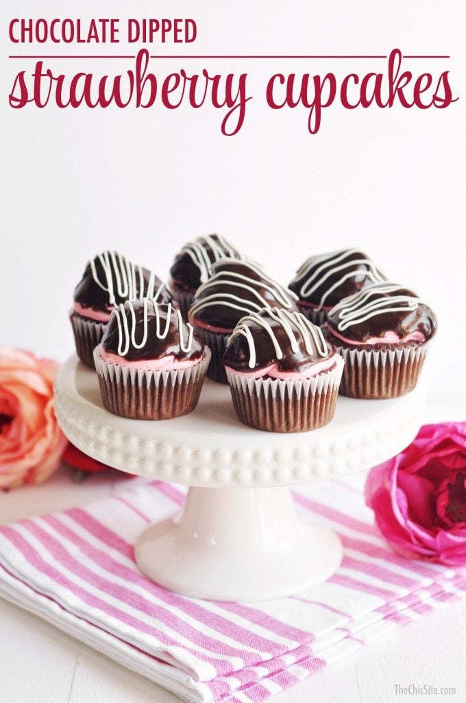 Valentine’s Day is just a few short days away. Are you ready? Just in case you’re still looking for the perfect gift/dessert that shows just how much you care, here at The Chic, we’ve got you covered with these Chocolate Dipped Strawberry Cupcakes! Rich chocolate cupcakes are loaded with strawberry frosting and then dipped in a chocolate ganache and drizzled with melted white chocolate. It has all of the flavors of chocolate dipped strawberries but so much better!