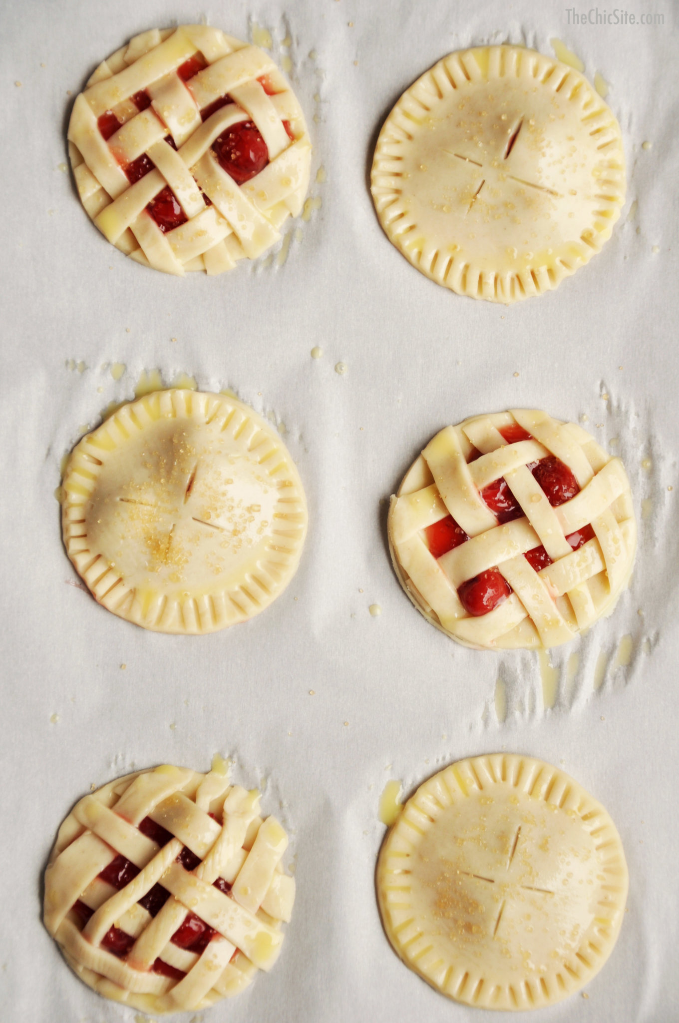 - On a lightly floured work surface unroll the pie crusts, working with one piece at a time. Keep the others in the fridge! Cut out 3-inch round cookie cutter, placing 24 rounds between the two baking sheets. Fill each with about 1 tablespoon of cherry pie filling.