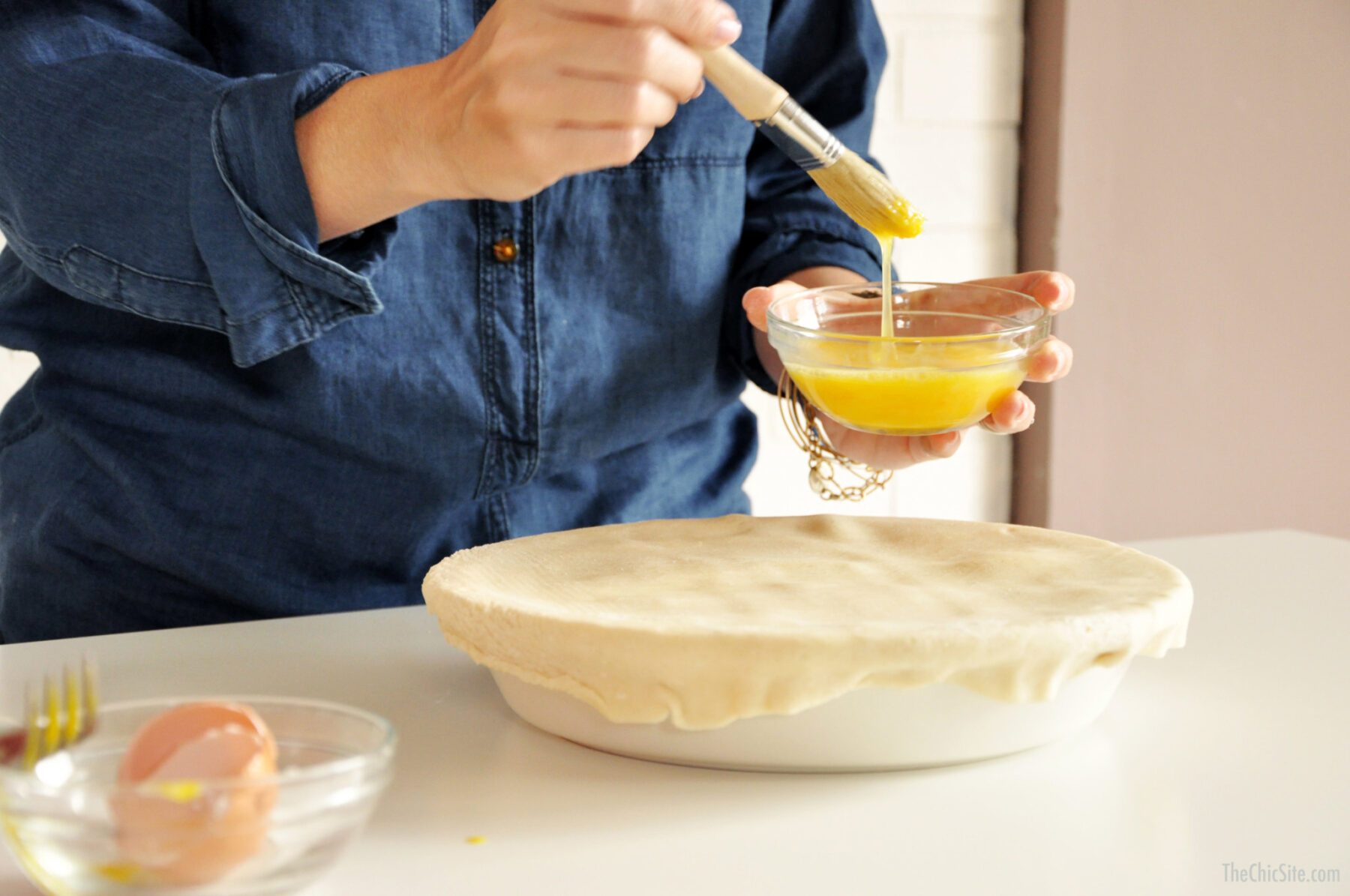 Mix together an egg and some water (I just whisk it together with a fork), then use a pastry brush to brush it all over the dough… this is how you get that golden brown crust! Cut four slits for ventilation, then I like to finish with some fresh cracked black pepper. Pop it in the oven and get ready to enjoy!