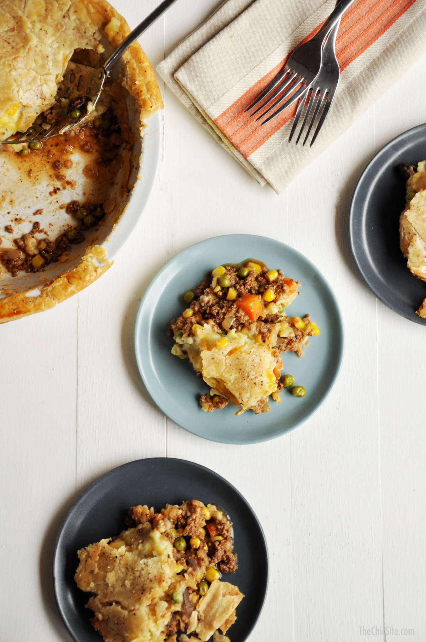 - Place the beef filling into a 9-inch pie dish. Top with the mashed potatoes and sprinkle with cheddar cheese. Place the pie crust on top of the potatoes, pressing the dough to the edge of the pie dish to somewhat seal. Brush the top liberally with the egg wash, make a few slits on the top to allow steam to escape and sprinkle with black pepper.