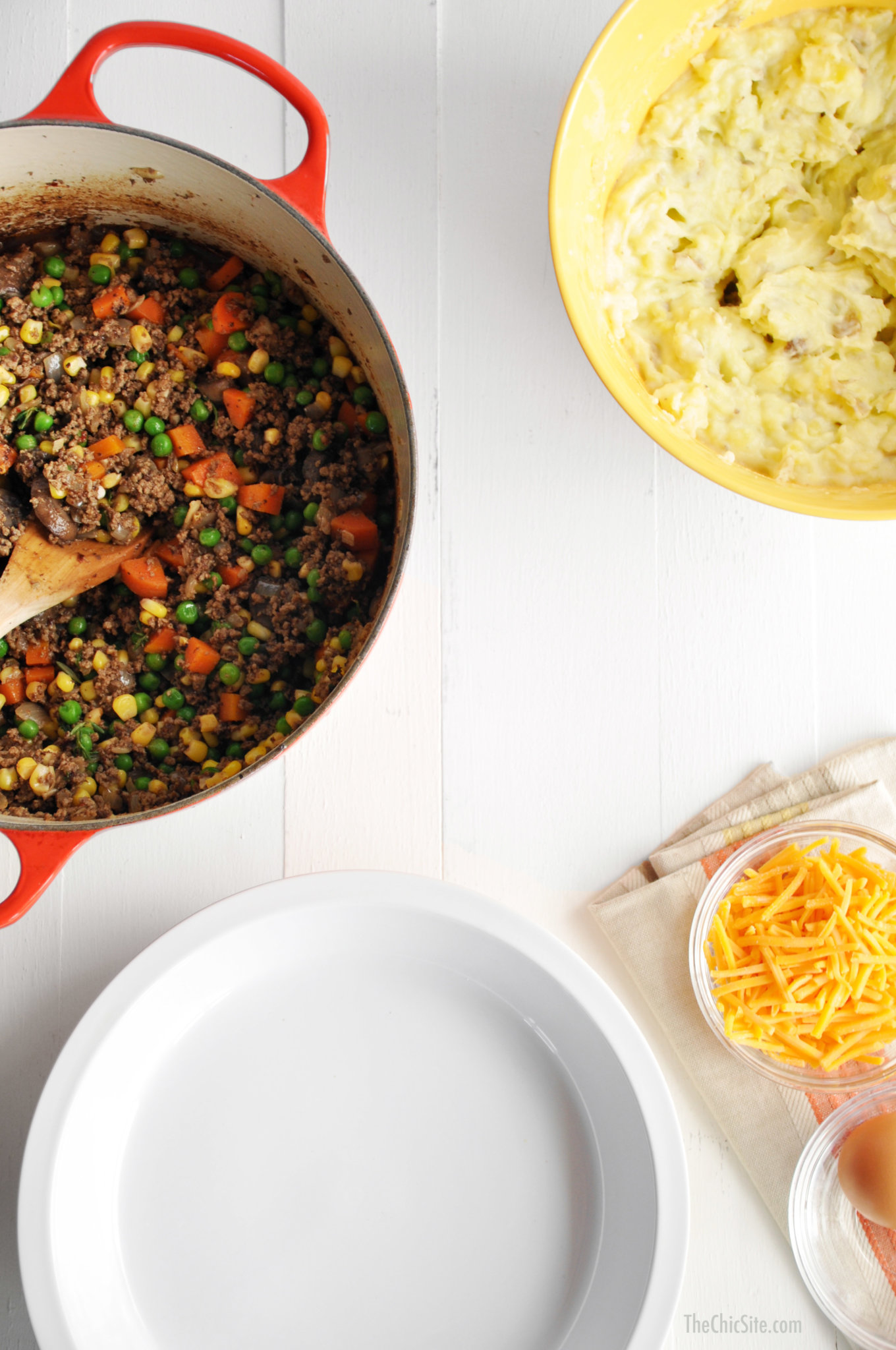 Now you need to mash your potatoes and then it’s time to assemble your Shepherd’s Pot Pie.