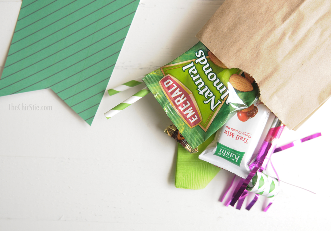 Fill your St Patrick’s Treat Bags with healthy snacks or fun treats. Then use a small clothespin to attach one or two coordinating pennants to the front of your bag. Super simple and totally adorable Irish themed party bags… you might just win room mom of the year with this one. ~Rachel