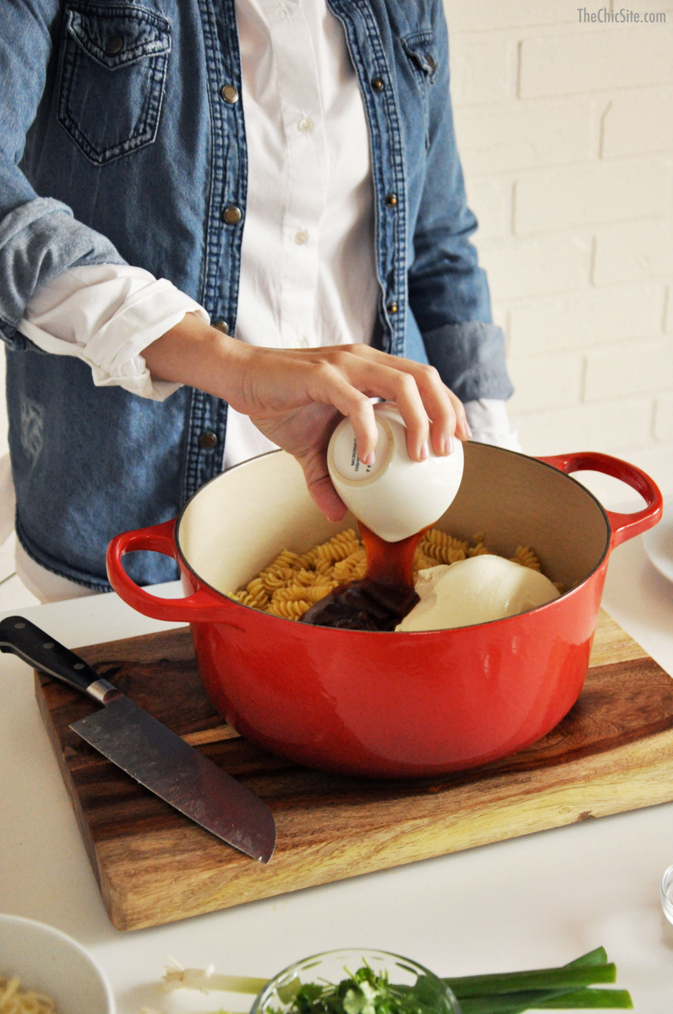 Start by pulling all the meat off the chicken… I suppose you could roast this chicken yourself but I just used a rotisserie from the store! Now you’ll need to boil your pasta to al dente (that means just a little bit tough) then drain and set to the side. Since you’ll be mixing it with sauce and baking it you don’t want it to be too soggy.