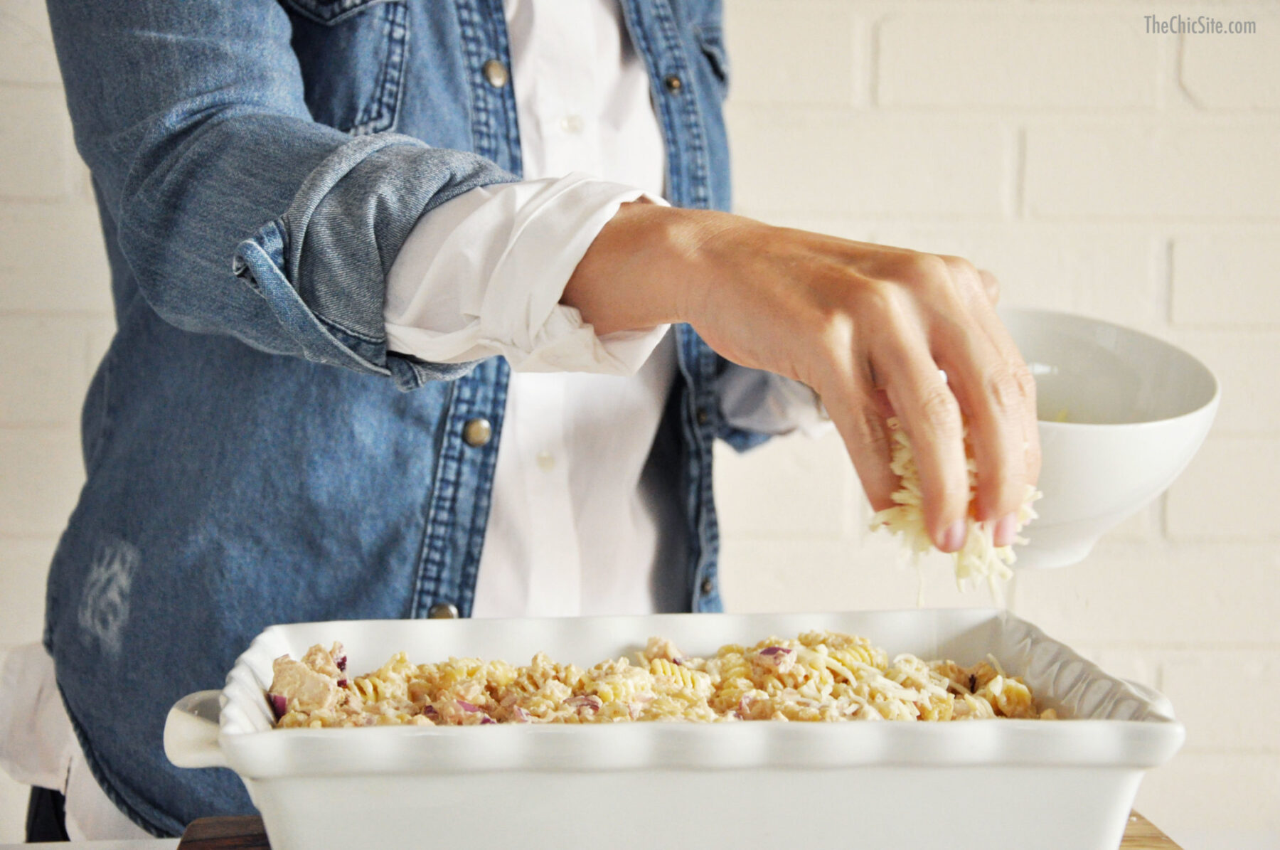 Now mix it all together and you’re ready to put it in your casserole dish and top with mozzarella cheese!