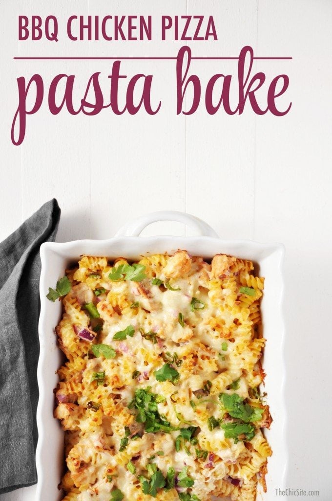 It’s pizza… but in pasta form! It’s a BBQ Pizza Pasta Bake and it’s darn delicious! Basically we just took all our favorite flavors from a BBQ Chicken Pizza and turned them into this to-do-for pasta dinner. Chicken, barbecue sauce, red onions, ricotta and mozzarella cheese all team up to make the yummiest dinner ever! Watch the video for the steps and then scroll down to see the full recipe. ~Rachel