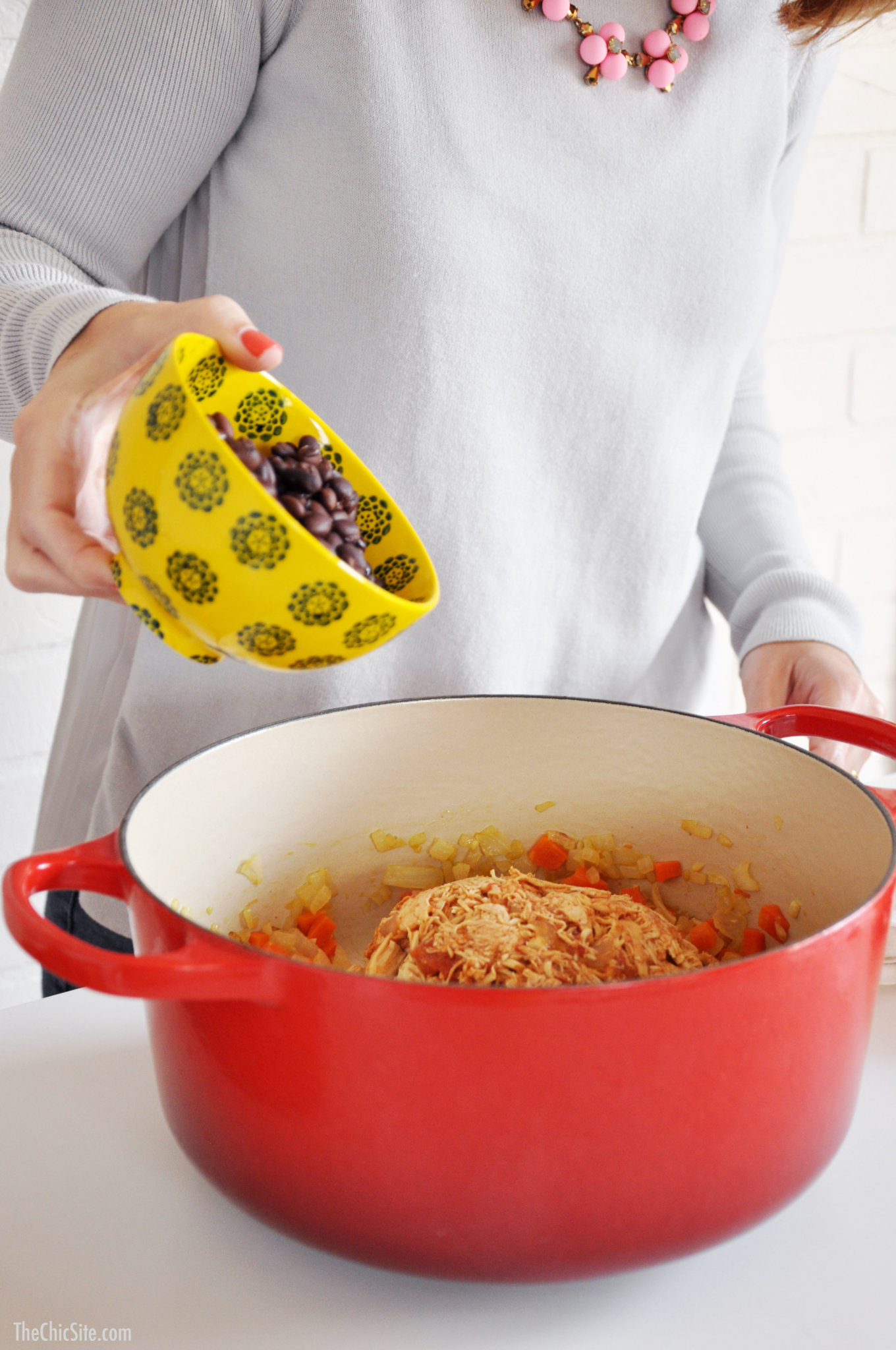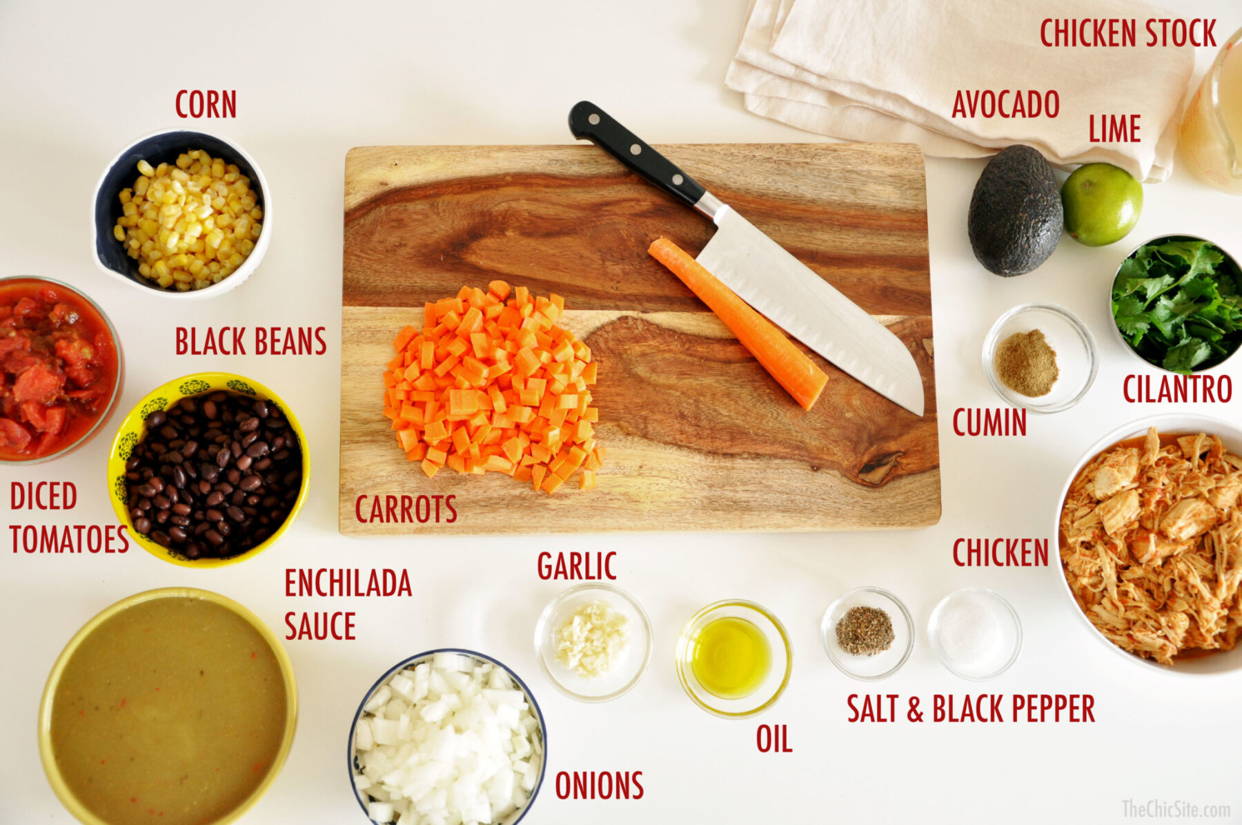 - Heat a large pot over medium-high heat. Add a drizzle of olive oil and add in the onions, garlic and carrots. Cook for about 5 minutes or until soft and just beginning to caramelize. Throw in the diced tomatoes, beans, corn, enchilada sauce, chicken broth, lime juice, cumin, salt, and pepper. Stir to evenly combine. Bring to a simmer, low the flame and cook for about 20 to 25 minutes.