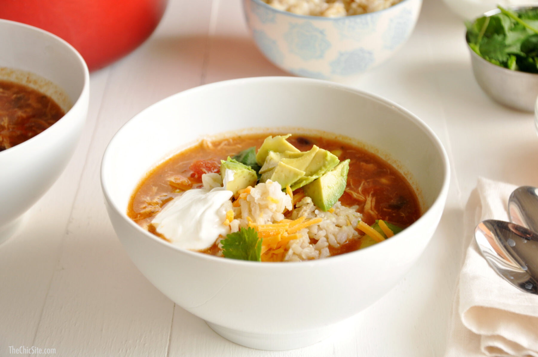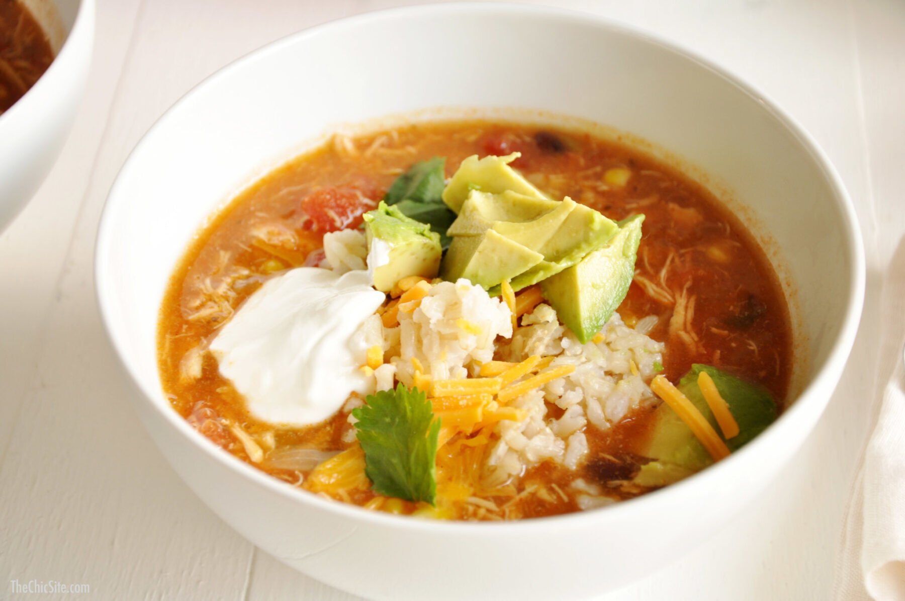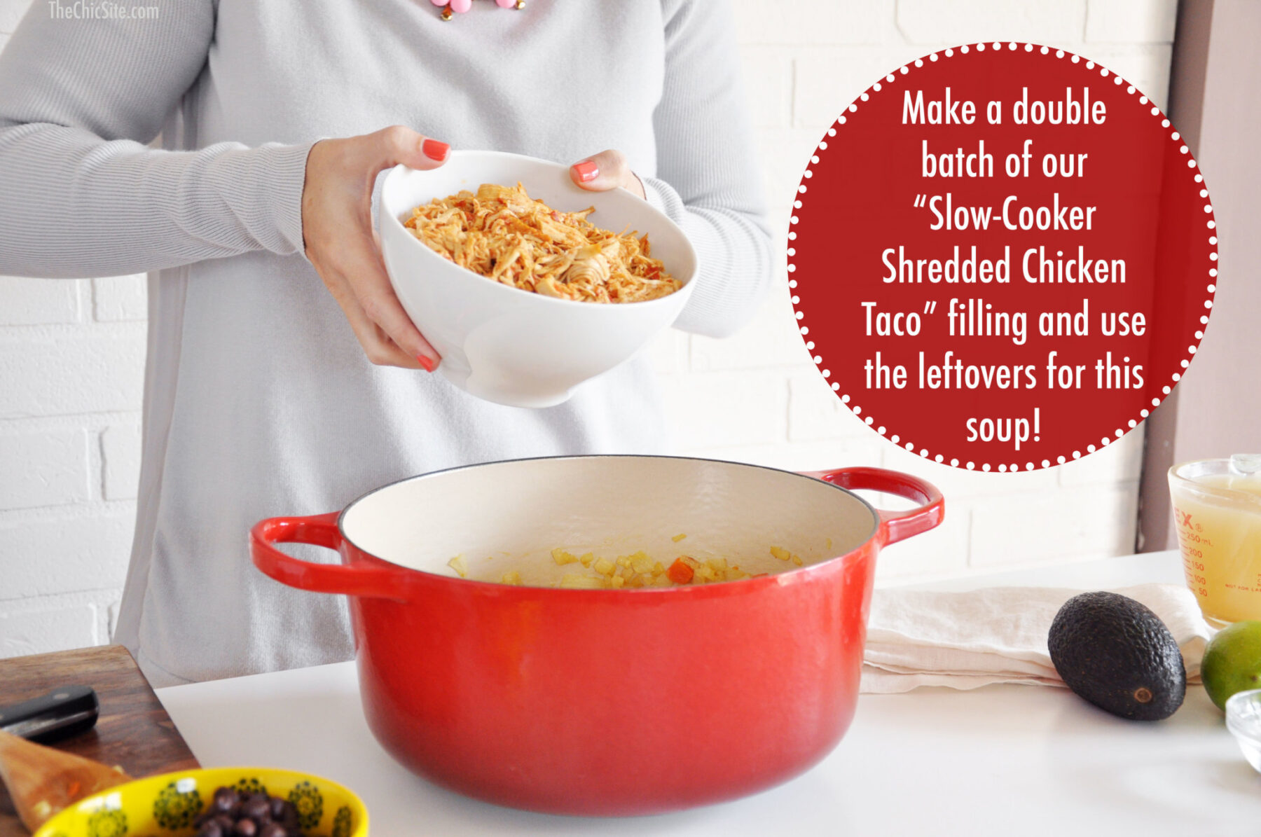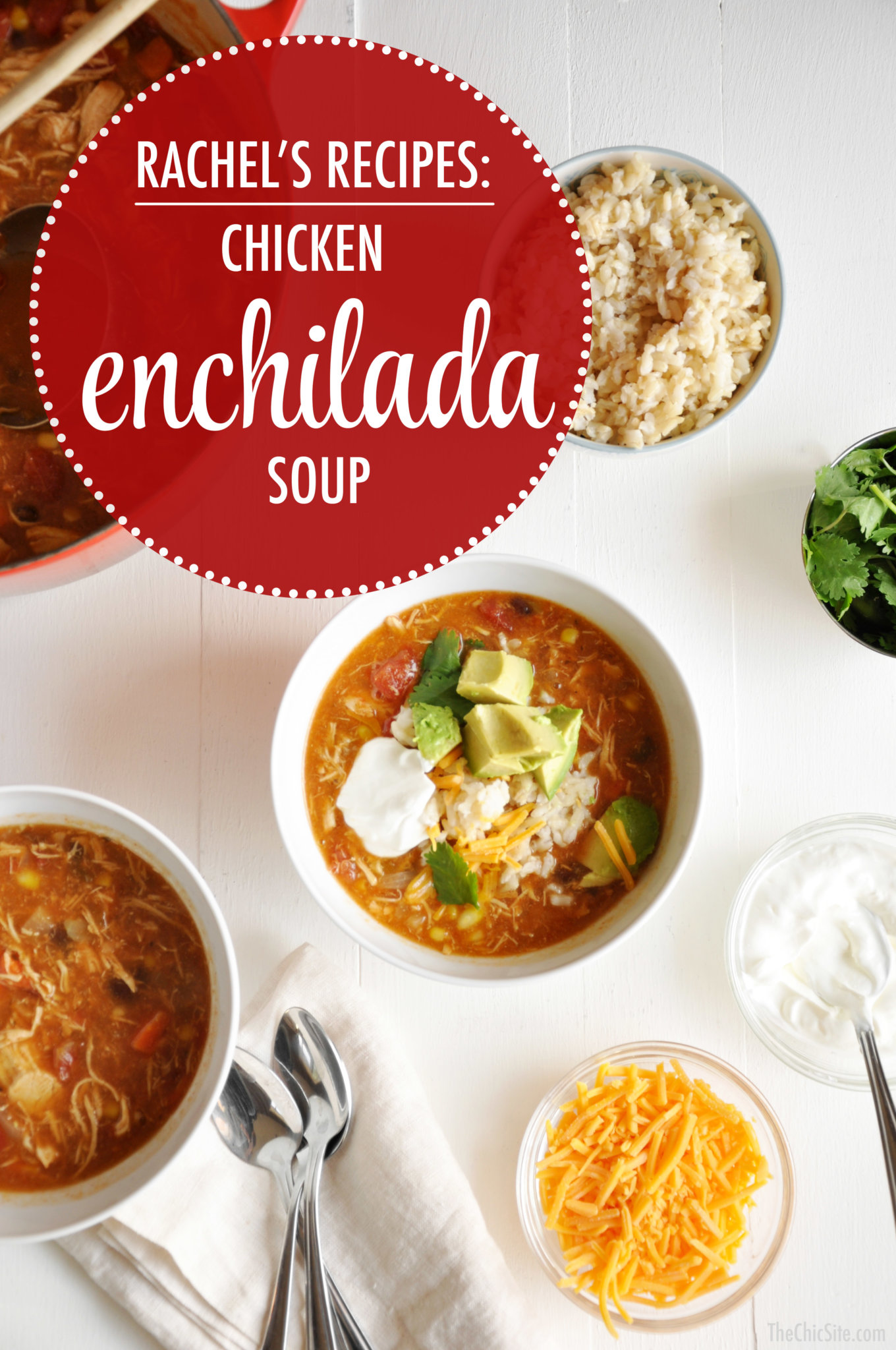 My mom is famous for many reasons, but the biggest of them all is her skill with leftovers. Seriously, Mama can look in a fridge filled only with mustard, pickles and week old bread and manage to cook a four course meal with it. She always kept us fed with the yummiest food and she always, always used up every single bit of the leftovers. In honor of her, I took the leftovers from our slow cooker chicken tacos and made my favorite Chicken Enchilada Soup! Watch the video for details and then scroll down for the full recipe. ~Rachel