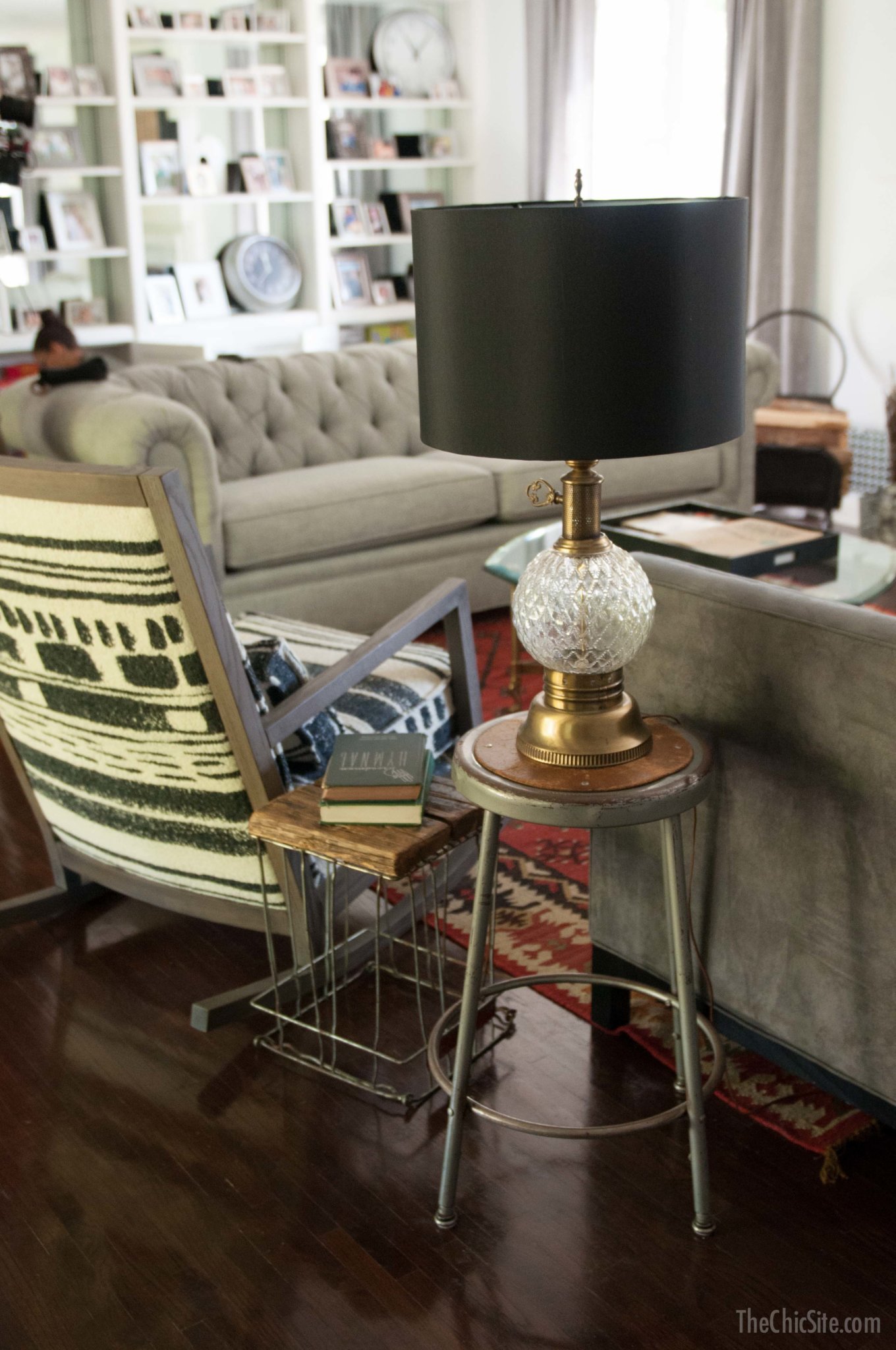 I love mix and match… can’t you tell? And so I did a driftwood and glass side table on one side of the couch and a collection of flea market finds on the other. This is an old classroom stool and a vintage egg crate turned upside down. Often times I’m not sure how I’ll use something I find at a flea market or yard sale but if I can get a good deal I’ll buy it and store it until I find the perfect location! The lamps were Dave’s grandparents and I just replaced their shades with something a little more modern.