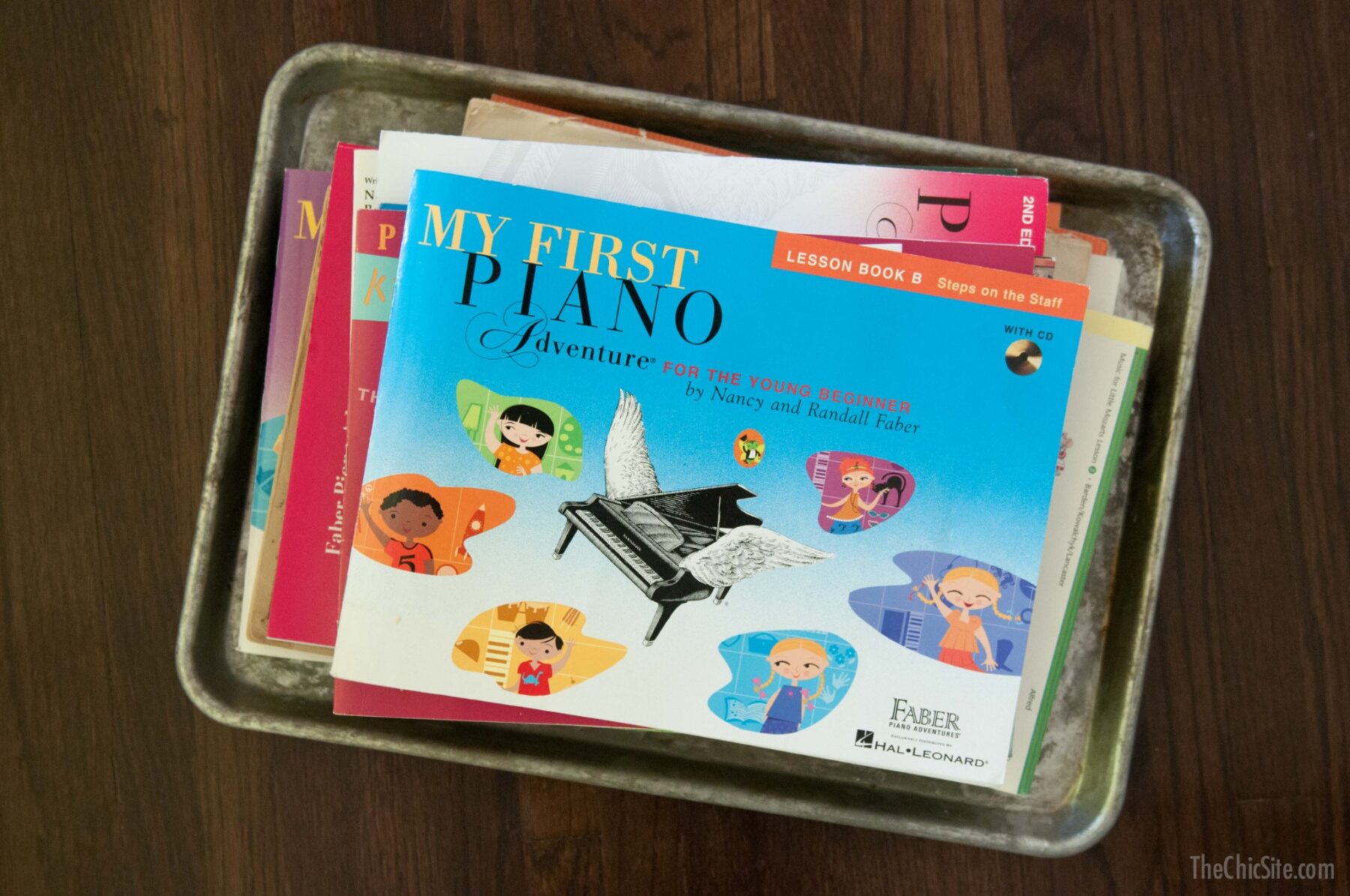 Here’s a sort of random storage idea… I couldn’t figure out where to store all of the boys piano lesson books so I stacked them on an old cookie sheet and put it on the backside of the sofa under the side table.
