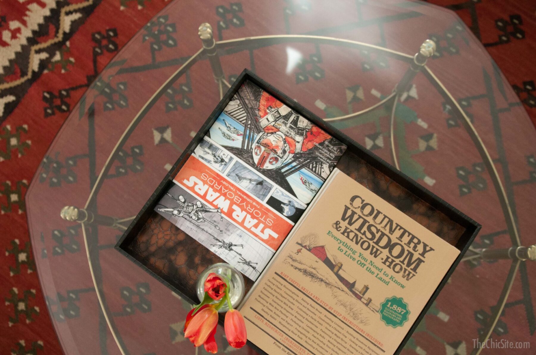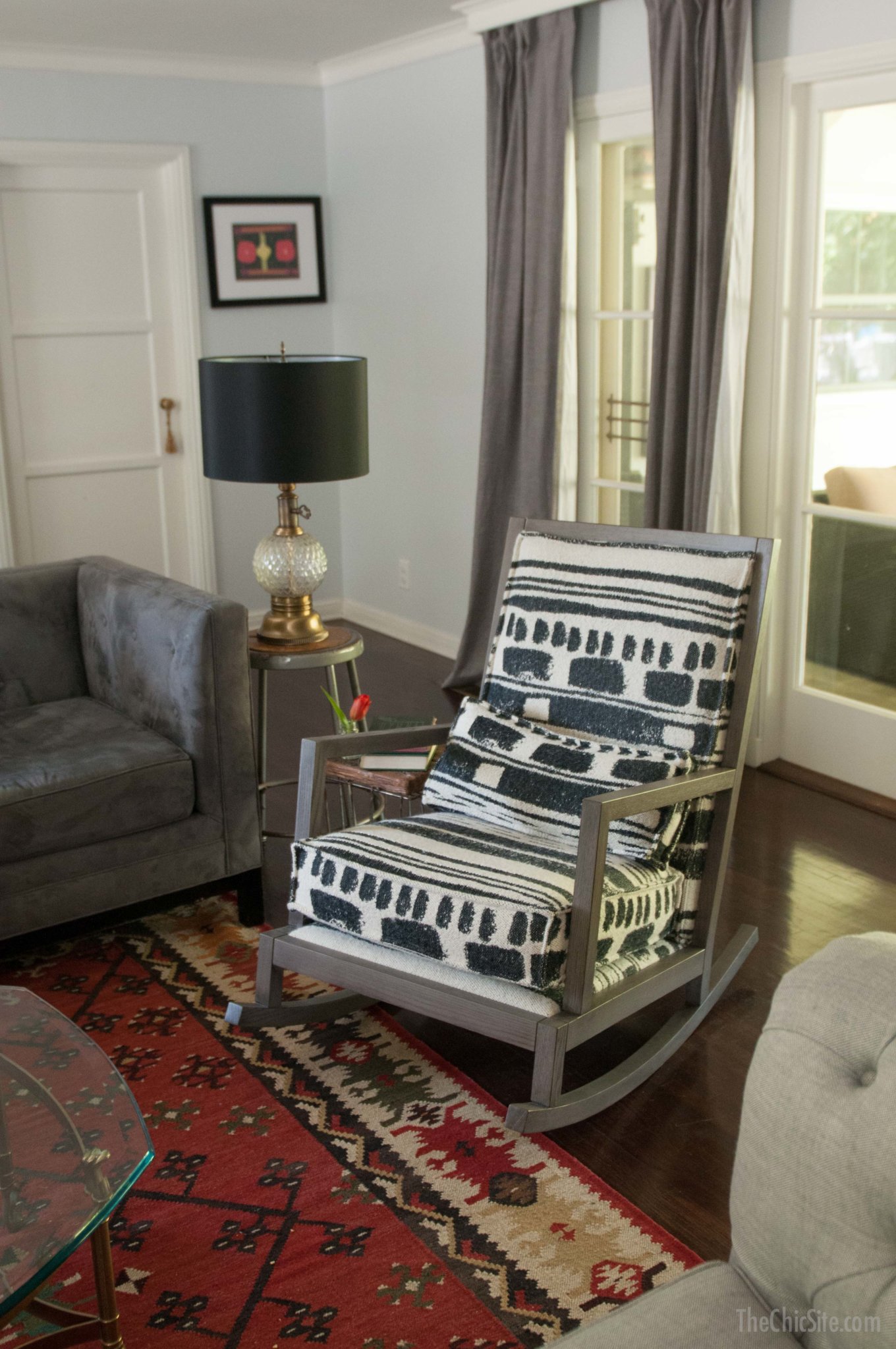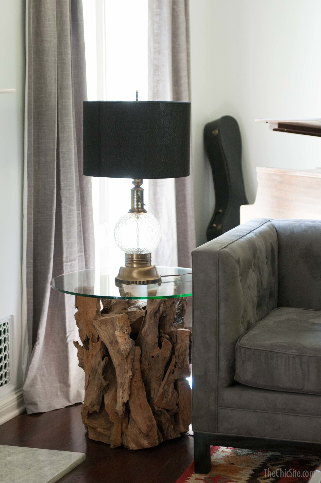 The coffee table is also something I got at the flea market years ago. We considered changing out for something more rustic but when I saw it in the room I loved it there. I really liked that it was so unusual juxtapose the texture of the rug. Also, I think wood would have really seemed heavy. With the glass top it feels lighter and you can see more of the rug.